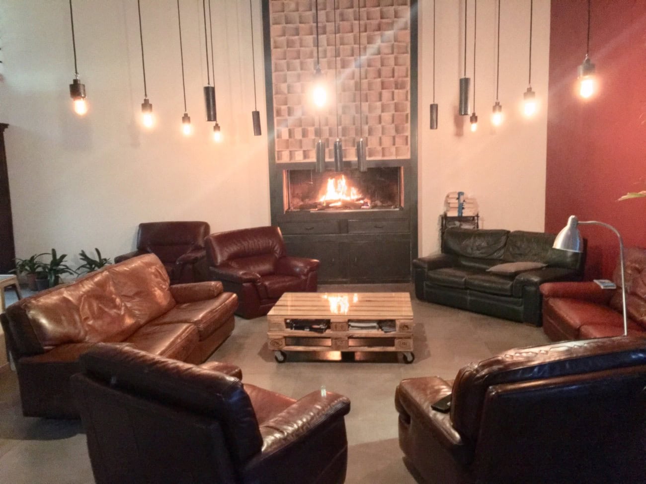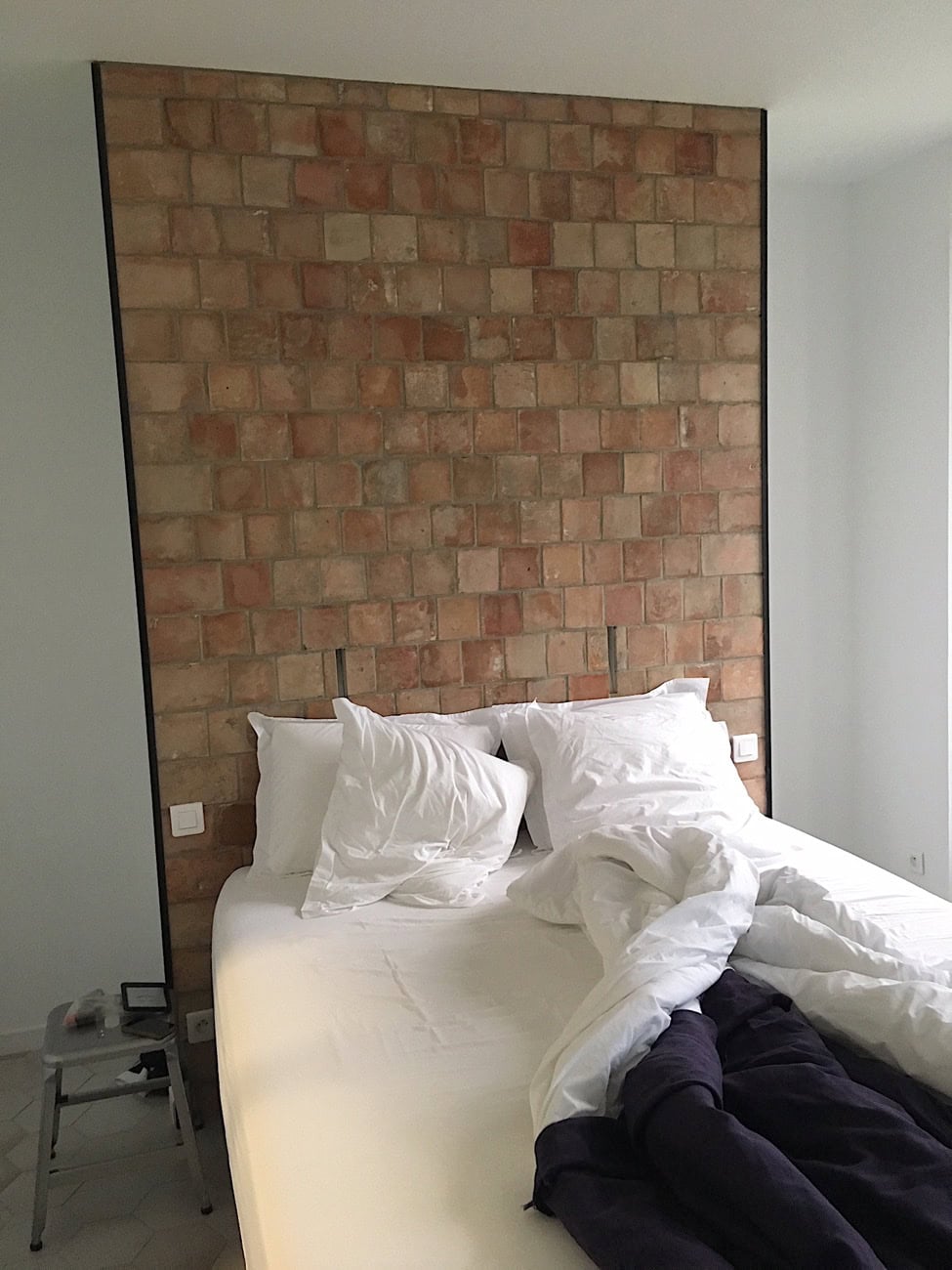 Über eine große, offene Holztreppe geht es eine Etage höher, wo sich die fünf geschmackvoll eingerichteten Gästezimmer befinden. Schon beim Betreten der Räume fällt die klare und ausgefallen Inneneinrichtung auf, deren Mittelpunkt eine mit groben Klinkern gemauert Wand ist, die am Kopfende des Bettes als Raumteiler für den dahinter liegenden Schrank dient. In die Klinkerwand sind schmal Schlitze integriert, die als Nachtischlampen dienen.