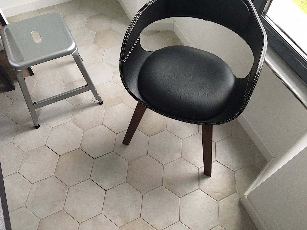 Dieses Interieur wird durch die dezenten, aber dennoch den Raum prägenden, beigen Bodenfliesen im Sechseckformat unterstrichen, die der gesamten Einrichtung gekonnt die Krone aufsetzen.