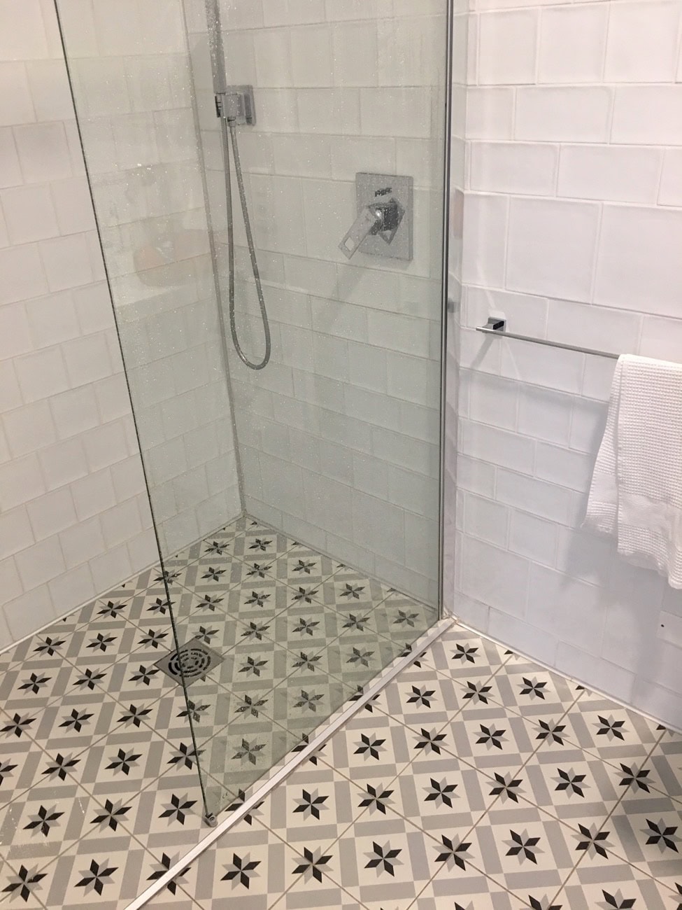 Der positive Eindruck des Schlafraums setzt auch in den Badezimmer nahtlos vor. Auch dort ließen die Bauherren und Besitzer gekonnt die Maxime „weniger ist mehr“ walten. Die weißen, glasierten Wandfliesen in Hammerschlagoptik bestechen bereits durch ihre tollen Oberflächen. Durch den Mix verschiedene Formate gewinnt die Fläche weiter an Ausstrahlung. Im gelungenen Kontrast dazu steht die Gestaltung des Bodens mit Platten in Zementfliesenoptik und alten Design, die das Ambiente perfekt machen.