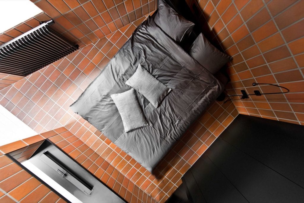 Bei diesem Apartment haben die Designer von YCL den verfügbaren Raum mit einer intelligenten Lösung genutzt und aufgeteilt: Eine schräg verlaufende Wand trennt den Raum in zwei gleich große Bereiche, zum einen Wohnbereich und Küche, zum anderen Schlafbereich und Bad. Ersterer ist kühl und leicht, letzterer warm und massiv. Der kühle Teil hat einen weißen Holzfußboden, eine weiße Decke und weiße Wände, während der Boden und die Wände des warmen Teils mit Fliesen in drei Schattierungen eines erdig rotbraunen Farbtons ausgekleidet sind. Die Fliesen stammen aus der Serie Goldine von Agrob Buchtal. Die Betondecke dieses Bereichs ist in einem Terrakotta-Farbton gestrichen, der mit den Fliesen korrespondiert. Die Verbindung zwischen den beiden kontrastierenden Bereichen schaffen schwarze, weiße und graue Möbel.