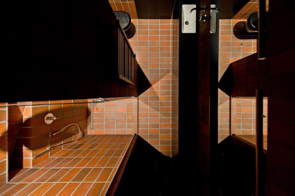 Schlafbereich und Bad strahlen Wärme und Solidität aus. Das Studio YCL wählte hierfür natürlich-erdfarbene Fliesen der Serie Goldline von Agrob Buchtal, wobei die Anmutung abhängig von Lichtart und Lichteinfall variiert.