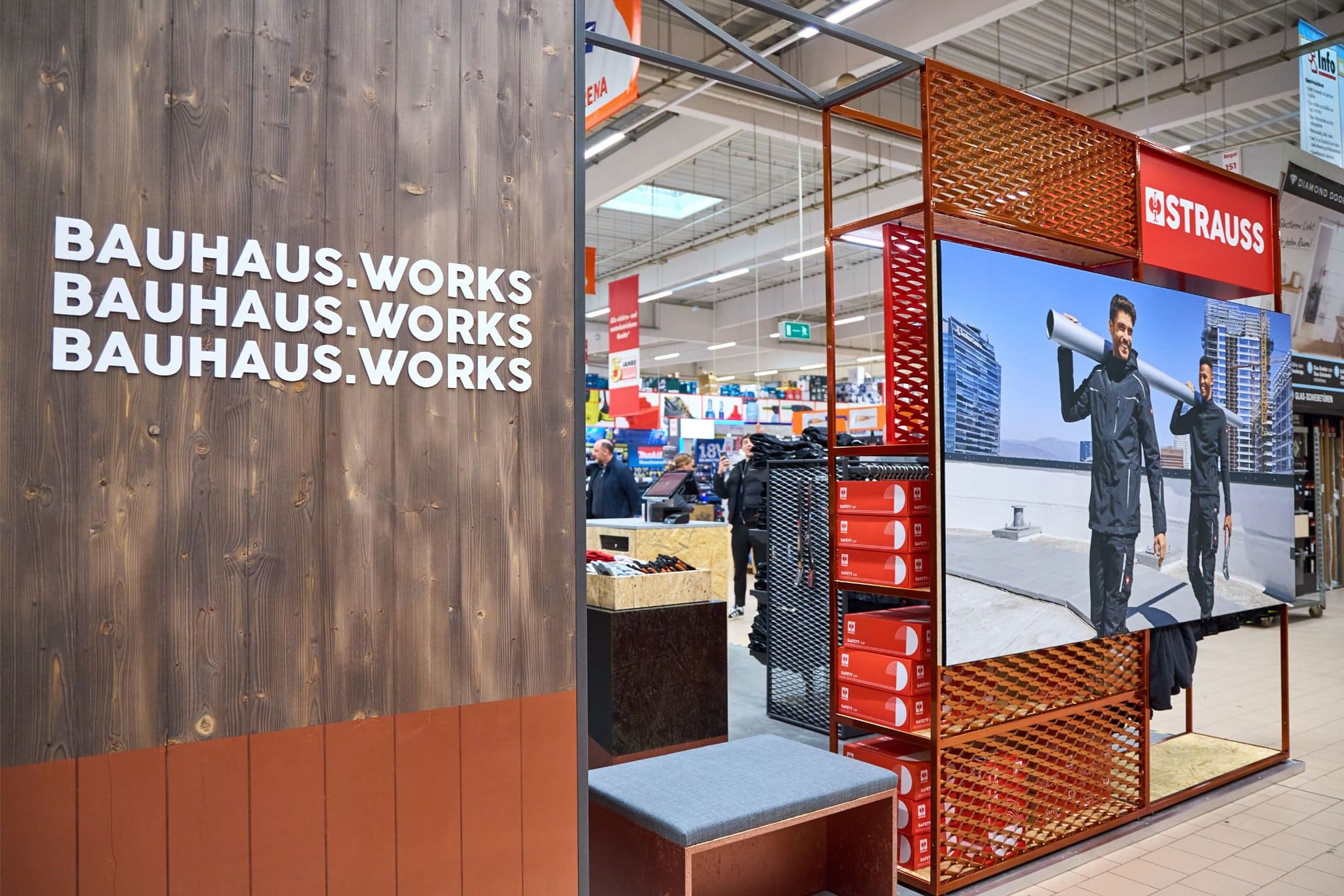 Mit der Eröffnung der Pop-up Stores wird Bauhaus Kunden erstmals und zusätzlich zum eigenen Warenangebot ein vielseitiges Sortiment an hochwertiger und funktionaler Workwear von Strauss direkt in den Fachcentren angeboten. Die moderne und funktionale Arbeitskleidung von Kopf bis Fuß liegt voll im Trend, spricht sowohl Profis als auch Heimwerker an und ergänzt das bestehende Bauhaus Sortiment perfekt. Das Angebot umfasst Produkte für Damen, Herren und ein Kampagnen-Shirt für Kinder.