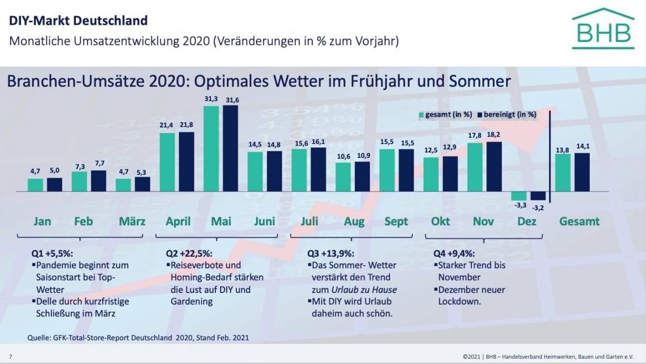 „Wir sind froh, dass die Handels- und Industrieunternehmen der Branche dieses im negativen Sinne Ausnahmejahr relativ gut überstanden haben. Unsere vorausschauende Arbeit und der pragmatische Umgang mit den Herausforderungen, die in den Sicherheits- und Beschränkungsmaßnahmen liegen, hat das Vertrauen der Kunden in die Bau- und Gartenfachmärkte deutlich gestärkt und sie haben unser Angebot genutzt, sich in sicherer Umgebung mit Beratung und Material für unzählige Projekte rund um ihr Zuhause einzudecken“, so Peter Tepaß, Sprecher des BHB-Vorstandes.