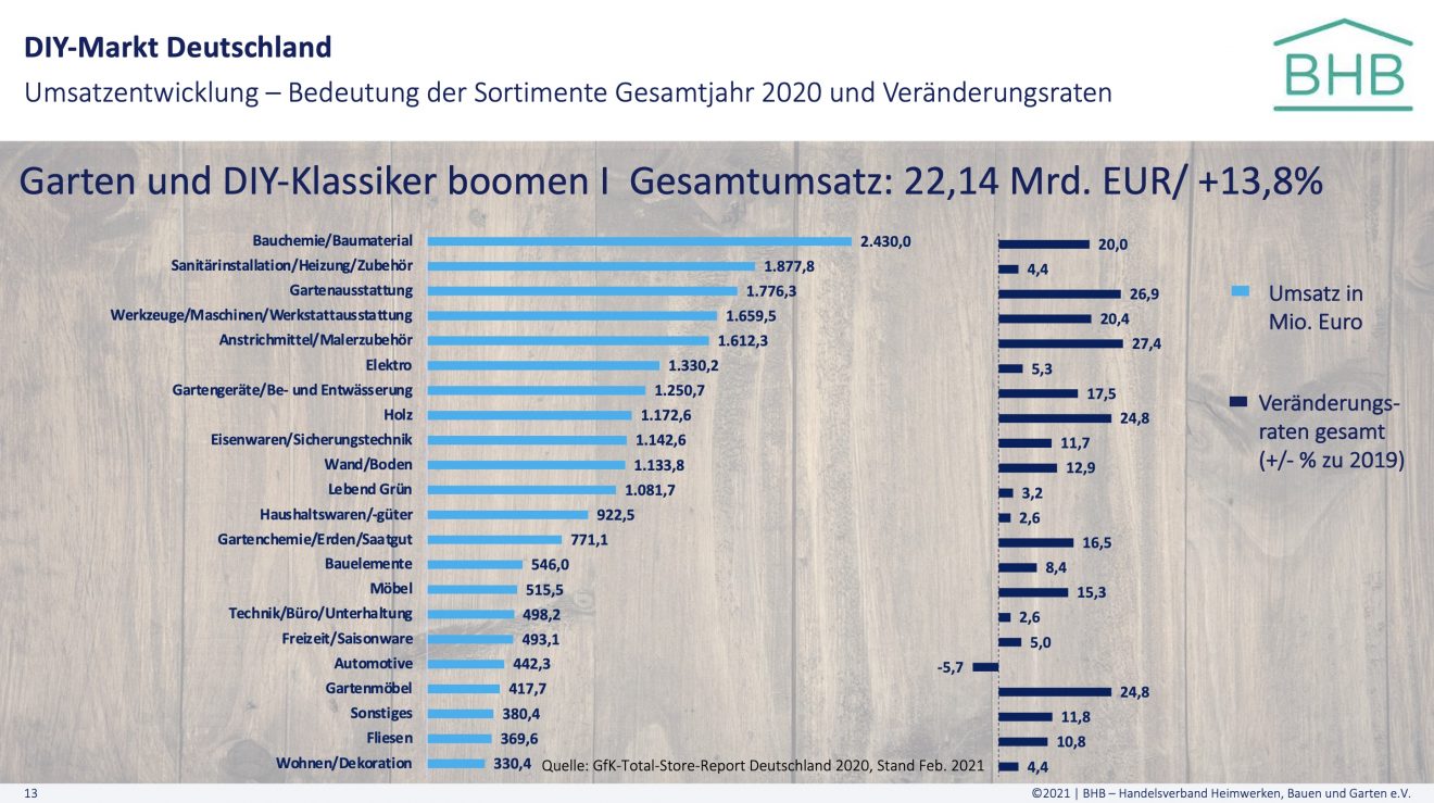 Die Bau- und Gartenfachmärkte konnten den Trend aus 2019 fortsetzen und in Deutschland einen Gesamtumsatz von 22,14 Mrd. Euro erzielen, das entspricht einem Plus von +13,8 Prozent (auf bereinigter Fläche von 14,1 Prozent). Die Marktzahlen, basierend auf aktuellen Werten der Gesellschaft für Konsumforschung (GfK), gab der Handelsverband Heimwerken, Bauen und Garten e.V. (BHB) im Rahmen seiner Jahrespressekonferenz Ende April 2021 in Köln bekannt.