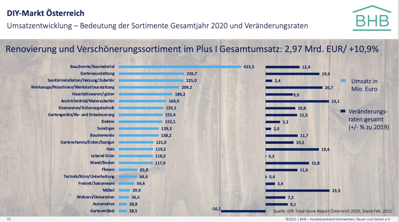 Der Konjunkturschub, den die Pandemie in Deutschland für den Handel mit DIY- und Gartensortimenten ausgelöst hat, lässt sich auch in Österreich in ähnlicher Form feststellen. Leichte Unterschiede im steilen Aufwärtstrend sind lediglich zu Beginn der Corona- Beschränkungen im Frühjahr festzustellen – der traditionell (durch die Gartensortimente) sehr starke Monat März blieb – ausgelöst durch einen längeren Lockdown auch für Bau- und Gartenfachmärkte im Nachbarland – um 35% unter den Umsatzwerten des Vorjahresmonats. Dies wurde aber durch Umsatzsputzen bspw. im Mai (+34,9 %) wieder ausgeglichen. Insgesamt legte die Bau- und Gartenmarktbranche in Österreich um +10,9 % (auf bereinigter Fläche um +9,8 % zu und erreichte einen Gesamtumsatz von 2,97 Mrd. Euro. Besonders stark wurden die Sortimente Möbel (+23,1 %), Anstrichmittel/Malerzubehör (+ 23,1 %) und Werkzeuge/Maschinen/ Werkstattausstattung (+20,7 %) gefragt. Rückläufig war 2020 nur das Sortiment der Gartenmöbel mit einem Minus von -16,2 %.