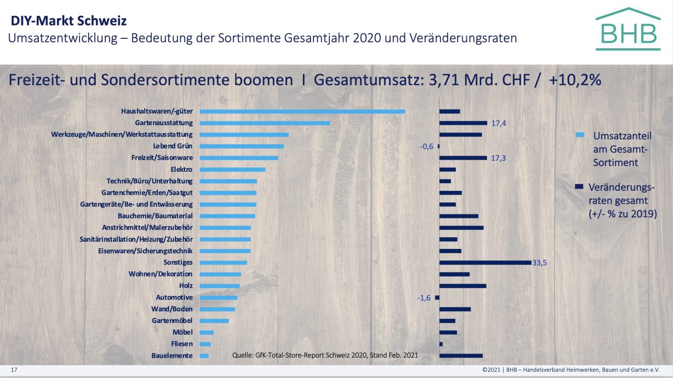 Die Sonderkonjunktur sorgte auch bei den eidgenössischen Bau- und Gartenfachmärkte für ein ungewöhnlich starkes Wachstum. Insgesamt konnten die DIY-Handelsunternehmen dort 3,71 Mrd. CHF umsetzen, dies ist ein Gesamtplus von +10,2 % (auf bereinigter Fläche +10,5%). „Sonstiges“ war im Corona-Jahr die Sortimentsgruppe mit dem stärksten Zuwachs: +33,5 %. Aber auch die Segmente Gartenausstattung (+17,4 %) und Freizeit-/Saisonware +17,3 % wuchsen rasant. Lediglich der Bereich Automotive verzeichnete mit -1,6% einen minimalen Rückgang.
