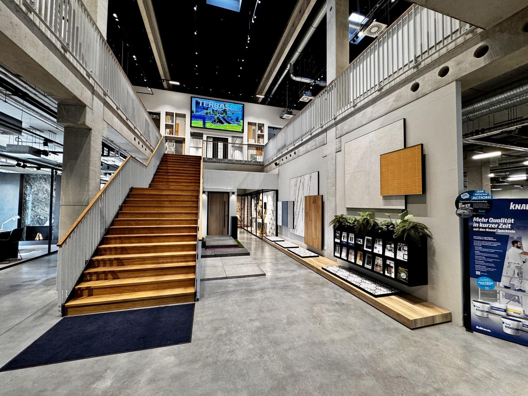 Über eine breite Holztreppe gelangt man in die obere Etage, wo Großformate und Feinsteinzeug wie Galerieobjekte inszeniert sind. Dezente Schranklösungen, klare Wege und ruhige Ambiente schaffen eine Atmosphäre, die Inspiration und Fachlichkeit miteinander verbindet „Manchmal ist weniger mehr“, sagt Nina Schieck. „Wichtig ist, dass sich unsere Kunden wohlfühlen und verstehen: Wir sprechen ihre Sprache.“