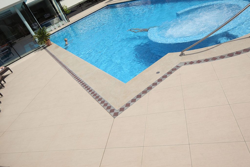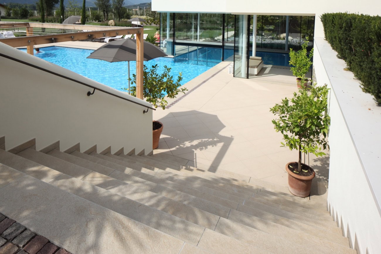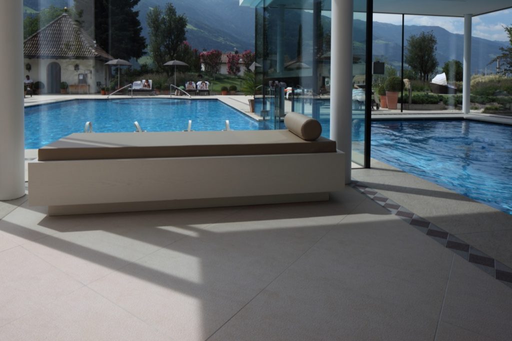 Stofflicher Komplize dieser Symbiose ist E.motions, eine Serie, die als Ausdruck ders dem Naturstein innewohnenden Designs entstanden ist. Die durch zarte Farben geprägte Kollektion des italienischen Herstellers Caesar beflügelt die Fantasie und lässt dem Planer maximale Freiheit bei der Umsetzung: auch dank der 20 mm starken Ausführung Aextra20. Eben dieses im warmen Farbton Warm Beige mit strukturierter Oberfläche und in den Formaten 60×60 und 60×120 cm verlegte System gestaltet die Innenböden des Spa-Bereichs und insbesondere jene des internen Swimming-Pools.