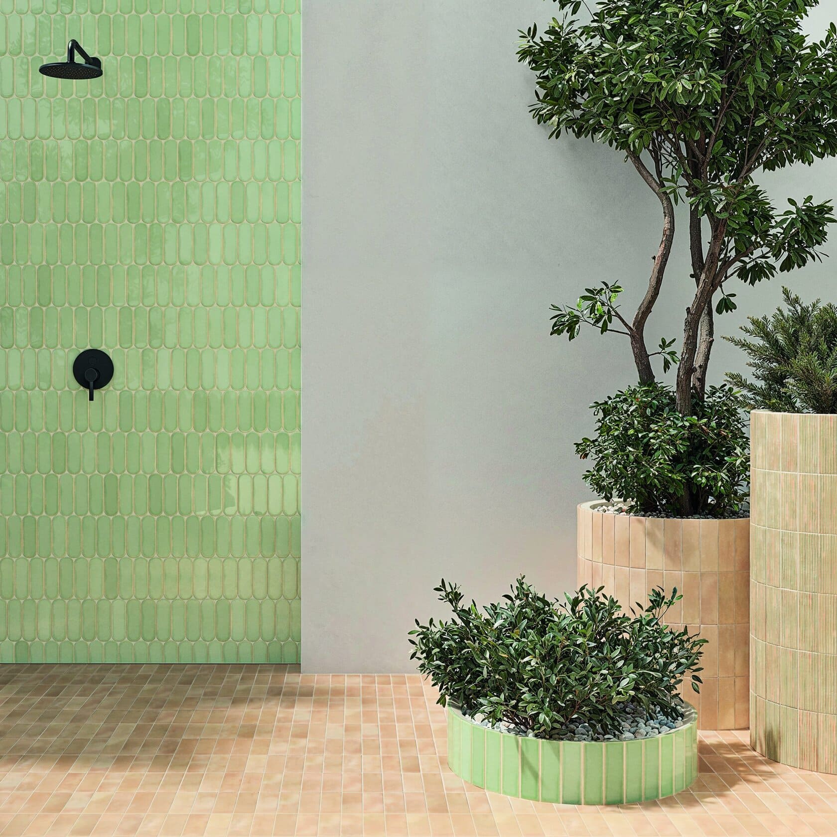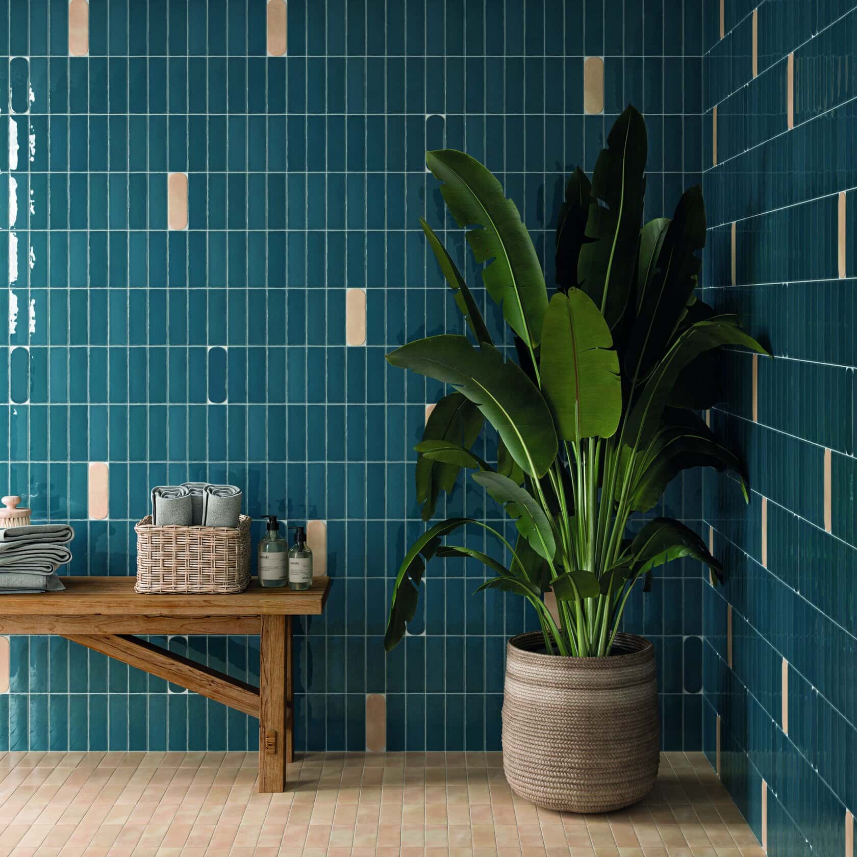 Die Kollektion besteht aus drei verschiedenen Teilen, die zu Kompositionen voller Rhythmus, Textur und Bewegung kombiniert werden können. Das Basisstück, ein 5×15 cm großes Rechteck, vermittelt durch seine leichten Größenunterschiede, die an traditionelle handgefertigte Fliesen erinnern, eine starke handwerkliche Essenz. Diese Unregelmäßigkeit unterstreicht ihren authentischen, natürlichen Charakter und verleiht jeder Oberfläche eine warme Note.