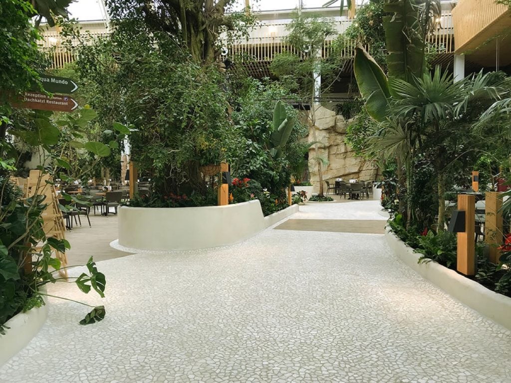 Center Parcs Allgäu, Leutkirch Ein Ferienpark der Superlative Im Oktober 2018 öffnete der neue Center Parcs Allgäu in Leutkirch seine Pforten. Es ist der sechste Ferienpark von Center Parcs in Deutschland und kann ohne Übertreibung als ein „Ferienparadies der Superlative“ bezeichnet werden. Sowohl beim Bau der subtropischen Badelandschaft „Aqua Mundo” als auch in den modernen und komfortablen Ferienhäusern, wurden Natursteine unterschiedlichster Art und Fliesen fachgerecht und sicher mit Produkten der Sopro Bauchemie verlegt. Bei der Auswahl der zum Einsatz kommenden bauchemischen Produkte ging es vor allem um ihre Eignung auf großen Flächen, bei einer gleichzeitig kurzen zur Verfügung stehenden Bauzeit mit engen Terminvorgaben.