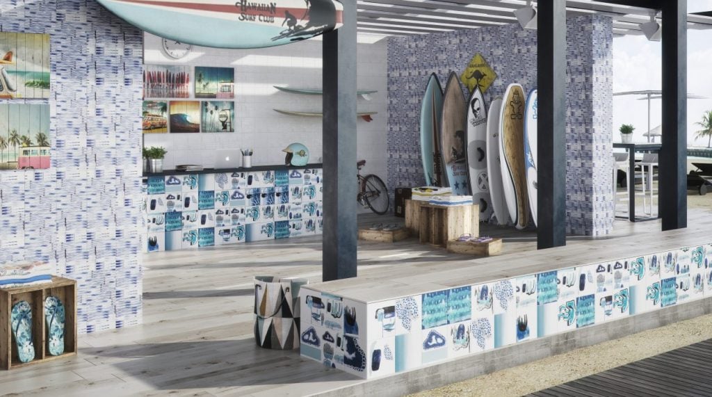 Rohe, unverputzte Wände, dazwischen Fliesen mit abgestoßen wirkenden Ecken, wild zusammengestellt, als wäre über die Jahrzehnte hinweg immer wieder etwas ausgebessert worden. Der ganze Raum erinnert an eine alte Markthalle mit Verladestation. Hinzu kommt ein Interieur, das den Namen Vintage auch verdient. Willkommen im neuesten Projekt des Designers Fancisco Segarra: dem Restaurant „La Guindilla“. Alle Fliesen in den Räumlichkeiten stammen aus der Kollektion FS by Peronda. Eine ebenso eindrucksvolle Atmosphäre findet sich auch im von ihm gestalteten Restaurant „Mexkisito“ in Madrid. Auch hier finden sich kleinformatige Mosaikfliesen im ornamentreichen Vintageflair, gemixt mit altwirkenden Holzoptiken und Metrofliesen. Dieser Look ist bezeichnend für die Arbeiten Segarras. Sein Stil ist vor allem geprägt durch unprätentiöse Dekore und authentische Retroausstattungen – damit setzt er den Industrial-Chic auf ein neues Level. Da entstehen schon mal eine alte Autowerkstatt aus den 50er-Jahren und ein chinesischer Fischmarkt als Messeauftritte des spanischen Fliesenherstellers Peronda.