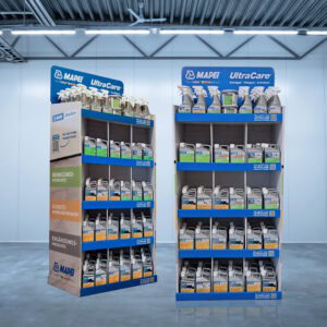 Um den Handel optimal zu unterstützen, steht neben dem Ultracare Produktfinder ein repräsentatives Regal mit technischen Unterlagen zur Verfügung. Dadurch ist es Händlern möglich, ein umfangreiches Produktprogramm von der Untergrundvorbereitung über den Ausgleich, die Verlegung, Verfugung bis hin zur Reinigung und Unterhaltsreinigung aus einer Hand anzubieten.
