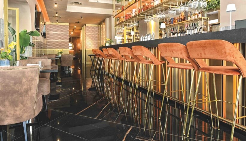 Von außen gelangt man an einem markanten goldenen Schild und großen Bogenfenstern vorbei direkt in den Bereich Living, der von einer langen amerikanischen Bar dominiert wird, umgeben von eleganten Hockern, Tischen und Sofas. Die Einrichtung wird durch den technischen Keramikboden Sahara Noir von FMG ergänzt, der einen raffinierten schwarzen Marmor zelebriert: Sein tiefschwarzer Hintergrund wird durch scharfe Blitze in Karamell-, Orange- und Cremetönen belebt, die an die goldenen Farbtöne und das warme Licht, das den Raum durchflutet, erinnern und diese reflektieren.