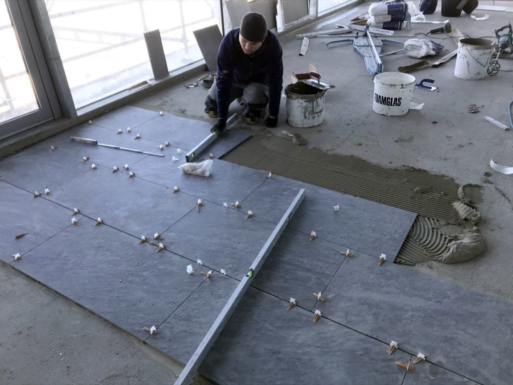 Beim Innenausbau der Stationen setzten die Bauverantwortlichen in weiten Teilen des öffentlichen Bereichs auf funktionale und zugleich optisch ansprechende Fliesenbeläge in verschiedenen Grautönen. Die Wand und Bodenbeläge der Berg und Talstation sind großformatige Feinsteinzeugfliesen von Marazzi (45 x 90 cm, 75 x 150 cm, 30 x 60 cm). Dadurch sorgen die großzügigen Fliesenflächen für ein modernes und ansprechendes Ambiente in den öffentlichen Bereichen. Ausgeführt wurden die Verlegearbeiten von der Fliesen Röhlich. Das Wendelsteiner Familienunternehmen hat sich in den letzten Jahren zu einem der größten Fliesenverlegebetriebe in Deutschland entwickelt – mit heute knapp 300 Fliesen und Natursteinverlegern, die insbesondere auf die fach- und termingerechte Umsetzung von überregionalen Großprojekten spezialisiert sind. Bei der Verlegung der Boden und Wandfliesen kamen zahlreiche Produkte aus dem Profi-Sortiment der Sopro Bauchemie zum Einsatz. Produkte, die auch den ganz besonderen Bedingungen auf Deutschlands höchster Baustelle gerecht wurden.