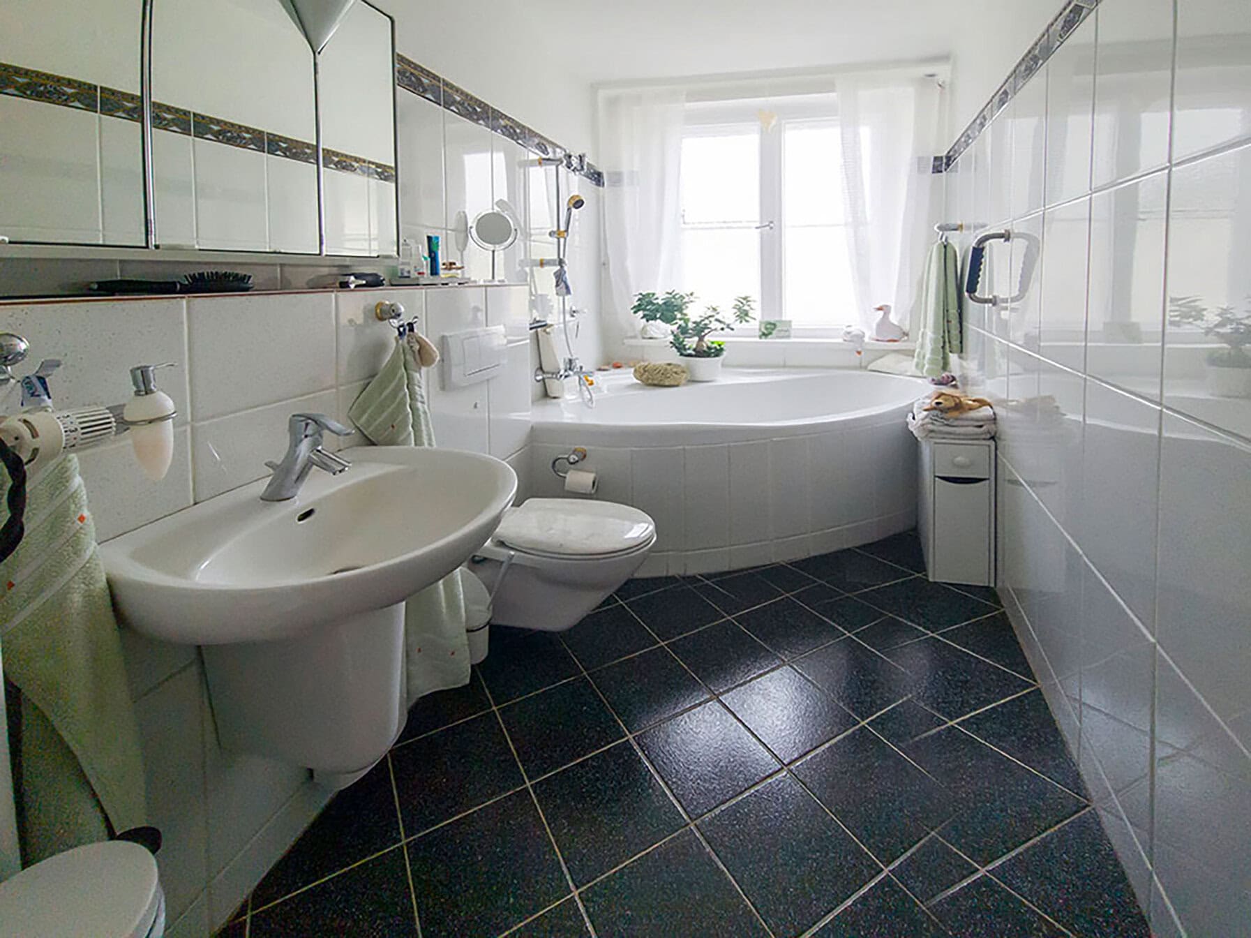 Das ursprüngliche Bad entsprach dem typischen Zustand vieler Bäder älterer Baujahre: wenig Platz, beengte Raumnutzung sowie eine klassische Eckbadewanne. Funktional, aber längst nicht mehr zeitgemäß.