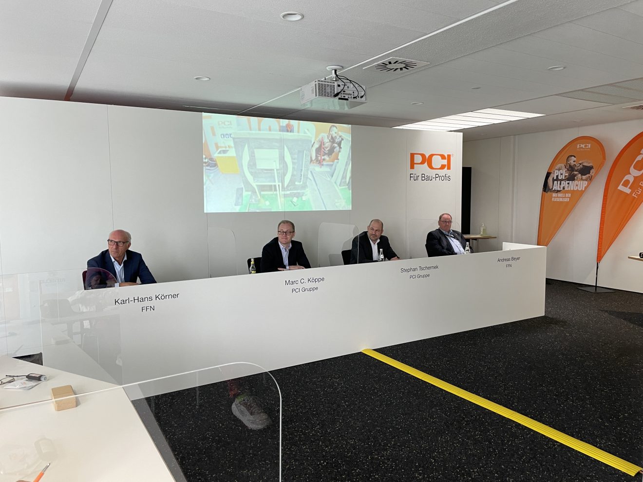 Auf der Pressekonferenz zum PCI-Alpencup v.l.n.r.): FFN.-Vorsitzender Karl-Hans Körner, PCI-Geschäftsführer Marc C. Köppe, PCI Marketingleiter Stephan Tschernek und Andres Beyer, Vorsitzender des Berufsbildungsausschusses im FFN-Vorstand. Im Hintergrund das Live-Bild der Webscams von der Wettkampf-Arena.