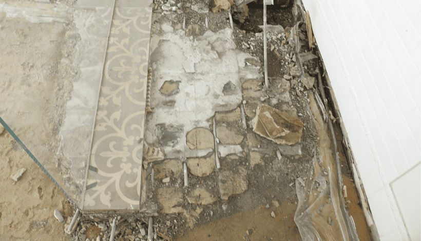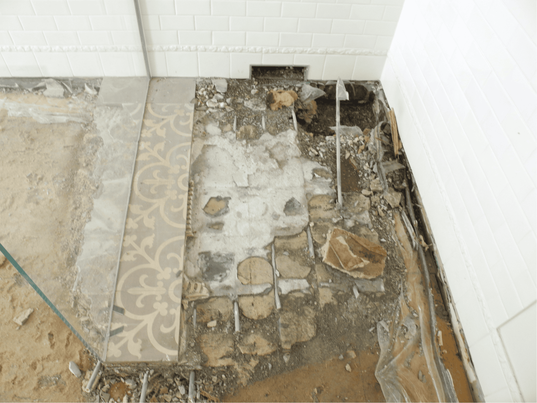 In einem Hotelzimmer wurde auf einer Holzbalkendecke versucht, eine bodengleich geflieste Dusche zu konstruieren. Die Kombination Estrich mit Fußbodenheizung, Wandablauf und nicht fachgerecht ausgeführte Abdichtung, führte am Ende zum Versagen der Konstruktion und zu einem kapitalen Bauschaden. Die historische Holzbalkendecke war nicht nur durchfeuchtet, sondern bereits morsch und musste ersetzt werden. Das Bad musste komplett zurückgebaut und die Geschoßdecke mit neuen Balken aufgebaut werden. Eine Kombination von Planungs-und Ausführungsfehlern führten zu einem Schaden von über 100.000 €.