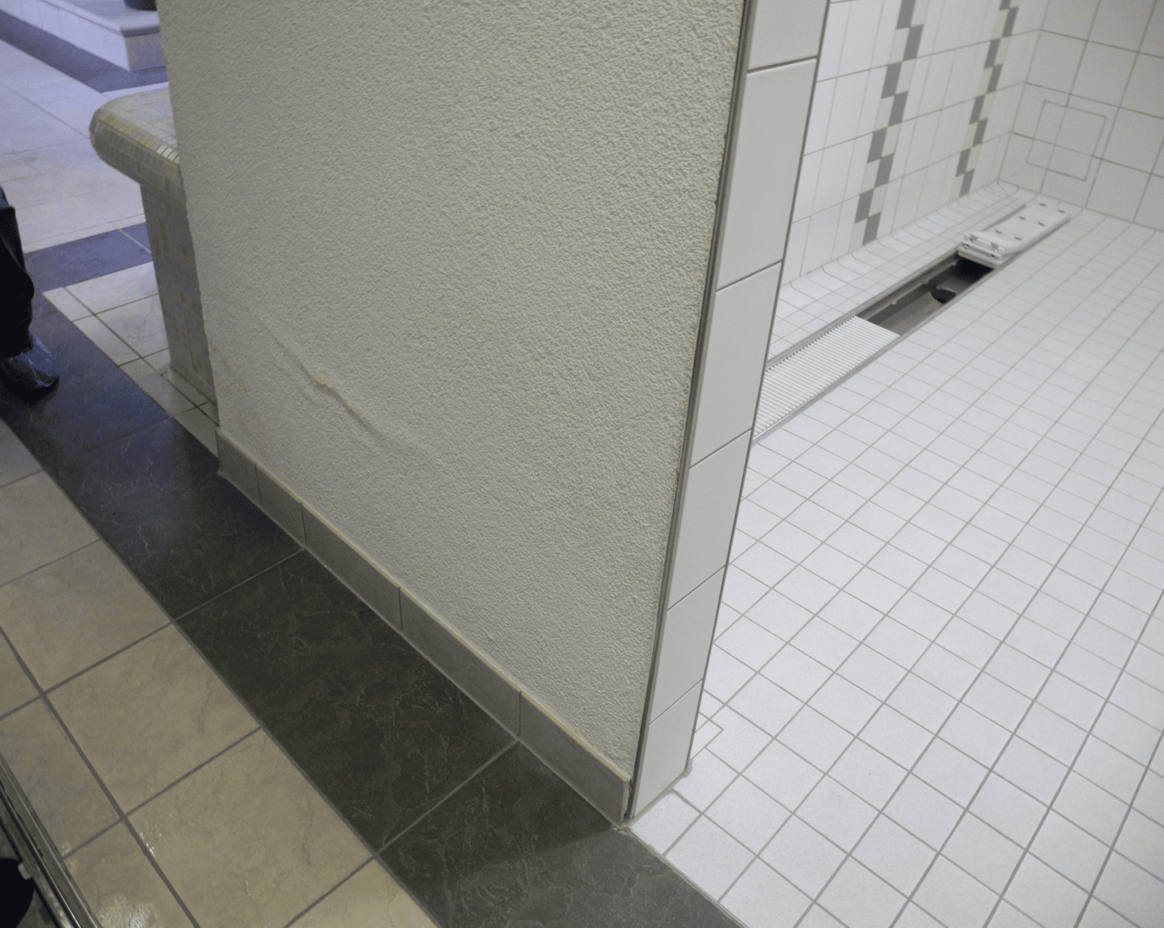In einer öffentlichen Saunaanlage war neben einem Rohrleitungsschaden in der Wand, die Edelstahlrinne in falscher Bauart gewählt. Die Rinne hatte keinen Abdichtungsflansch. Somit konnte die vorhandene Abdichtung im Verbund (AIV-F) unter den Fliesen, nicht fachgerecht mit der Rinne verklebt werden. Die Folge nach einigen Jahren Betrieb war nicht nur das erkennbare Wölben und Abplatzen des Wandputzes und der Farbe, sondern eine komplette Unterspülung des Bodenaufbaus auf einer Fläche von etwa 250 qm. Die komplette Saunaanlage musste entkernt und erneuert werden. Schadenssumme etwa 350.000 €