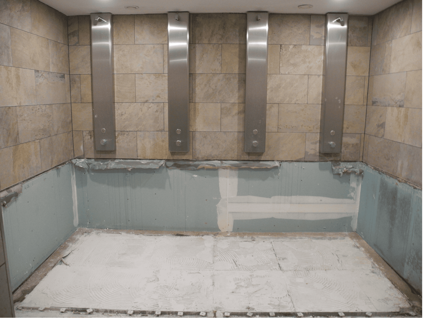 In einer Industrieduschanlage hat die Abdichtung versagt und die Untergründe aus feuchteempfindlichen Baustoffen waren nach einigen Jahren Wasserbefall bereits verrottet und nicht mehr zu retten. Die Duschanlage musste komplett entkernt und erneuert werden. Schadenssumme 60.000 €