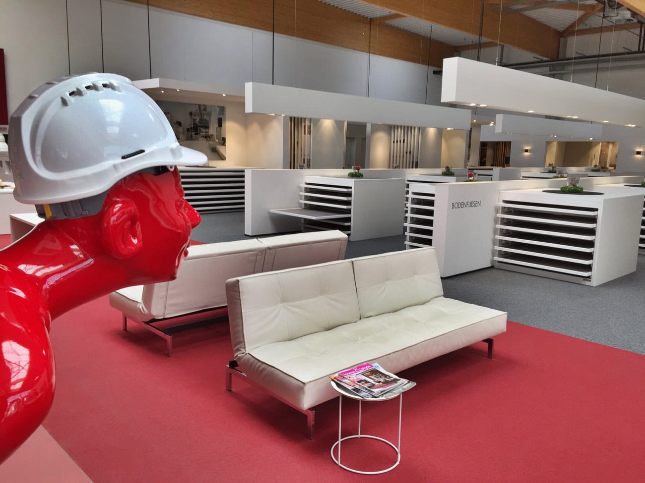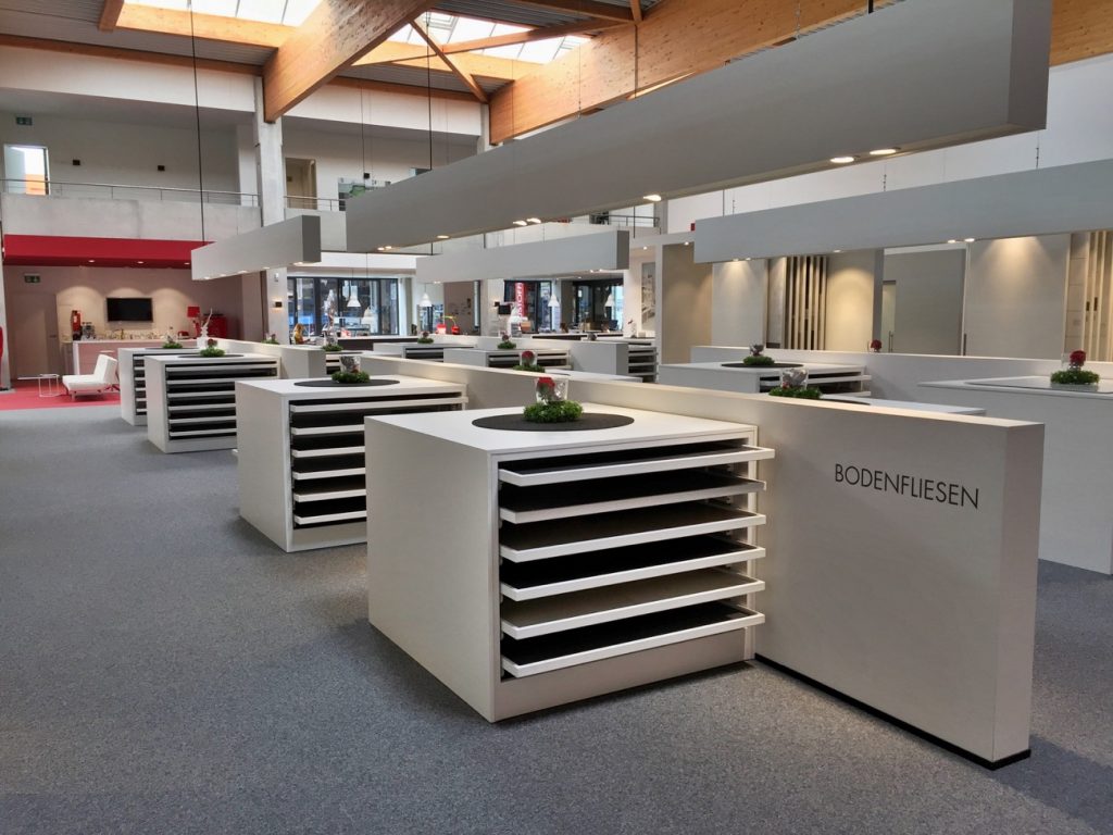 So kam eine 1500 Quadratmeter große Mischung aus Kojen, Musterschränken, Beratungszonen, Showtafeln etc. zusammen, die sicherlich unter Deutschlands Fliesenausstellungen zu den Besten ihrer Art gehört.