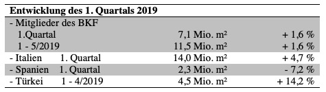 Die deutschen Fliesenwerke, die im Bundesverband Keramische Fliesen (BKF) zusammenge-schlossen sind, haben laut Hansa demnach im 1.Quartal ein leichtes Plus von 1,6 % auf 7,1 Mio qm erzielt. Die italienischen Werke konnten sogar ein Plus von 4,7% auf 14 Mio. qm erreichen. Negativ verlief dagegen der Jahresstart für die Spanier: Hier gab es ein Minus von 7,2% auf 2,3 Mio. qm. Auffallend positiv die Zahlen der Türken: Hier errechnete die Hansa Marktforschung sogar ein Plus von 14,2 % auf 4,5 Mio. qm für die ersten vier Monate des laufenden Jahres.