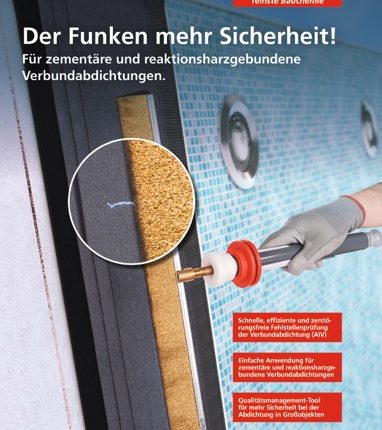 Um bereits im Vorfeld einer Probebefüllung Fehlstellen in der Abdichtung zu identifizieren, bietet die Objektberatung der Sopro Bauchemie jetzt mit eScann erstmals eine elektrische Fehlstellenprüfung für zementäre und reaktionsharzgebundene Verbundabdichtungen an. Mittels eines elektrischen Fehlstellenmessgeräts und einer leitfähigen Zwischenschicht, bestehend aus dem Sopro Kupferband und einer leitfähigen Spachtelung, wird die Abdichtung überprüft. Das in Anlehnung an die DIN 55670 – „Prüfung von Beschichtungen auf Poren und Risse mit Hochspannung“ – entwickelte System ermöglicht eine vollflächige Fehlstellenprüfung des gesamten Abdichtungsystems und damit eine schnelle und effiziente Identifizierung von Poren, Löchern und Rissen. Die zerstörungsfreie Prüfung funktioniert bei allen flüssig zu verarbeitenden Sopro Abdichtungssystemen. So können Mehrkosten und Bauverzögerungen durch mögliche zusätzliche Probebefüllungen nachhaltig vermieden werden.