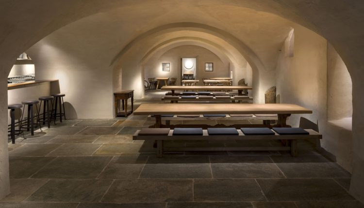Dem Stil des Hauses entsprechend kamen auch beim großen Makeover des Palais Kellers nur edle und hochwertige Materialien zum Einsatz. Innerhalb von einem halben Jahr, zwischen April 2019 und Oktober 2019, ließ Hotelinhaberin Innegrit Volkhardt die traditionsreichen Gemäuer umbauen. Mit Feingefühl hat Axel Vervoordt der historischen Bausubstanz eine neue Dimension und Authentizität gegeben. Wände und Decken samt Rundbögen in dem 1425 als Salzlager errichteten Palais Keller wurden freigelegt und mit heller Kalkfarbe in einen ursprünglichen Zustand zurückgeführt. Fast unweigerlich fällt jedoch der Blick auf den Steinboden, der mit seiner naturrauen, grau-silbrigen Oberfläche an ein Straßenpflaster erinnert. Und als solches hatte der antike „Luserna Gneis“ Naturstein auch vor bereits 400 Jahren in Straßen Italiens seine Funktion. Vervoordt, der sich auch als Kunstsammler und Antiquitätenhändler international einen Namen gemacht hat, kaufte vor einiger Zeit das Naturmaterial, das jetzt als Restaurantboden seine vorerst finale Bestimmung gefunden hat. Und auch der Tisch auf dem Steinboden hat eine Geschichte: Er wurde aus einer Eiche gefertigt, die der belgische Inneneinrichter noch als lebenden Baum kannte. Seither stand die Tafel in seinem Garten, nun speisen die Gäste des bayerischen Restaurants daran.