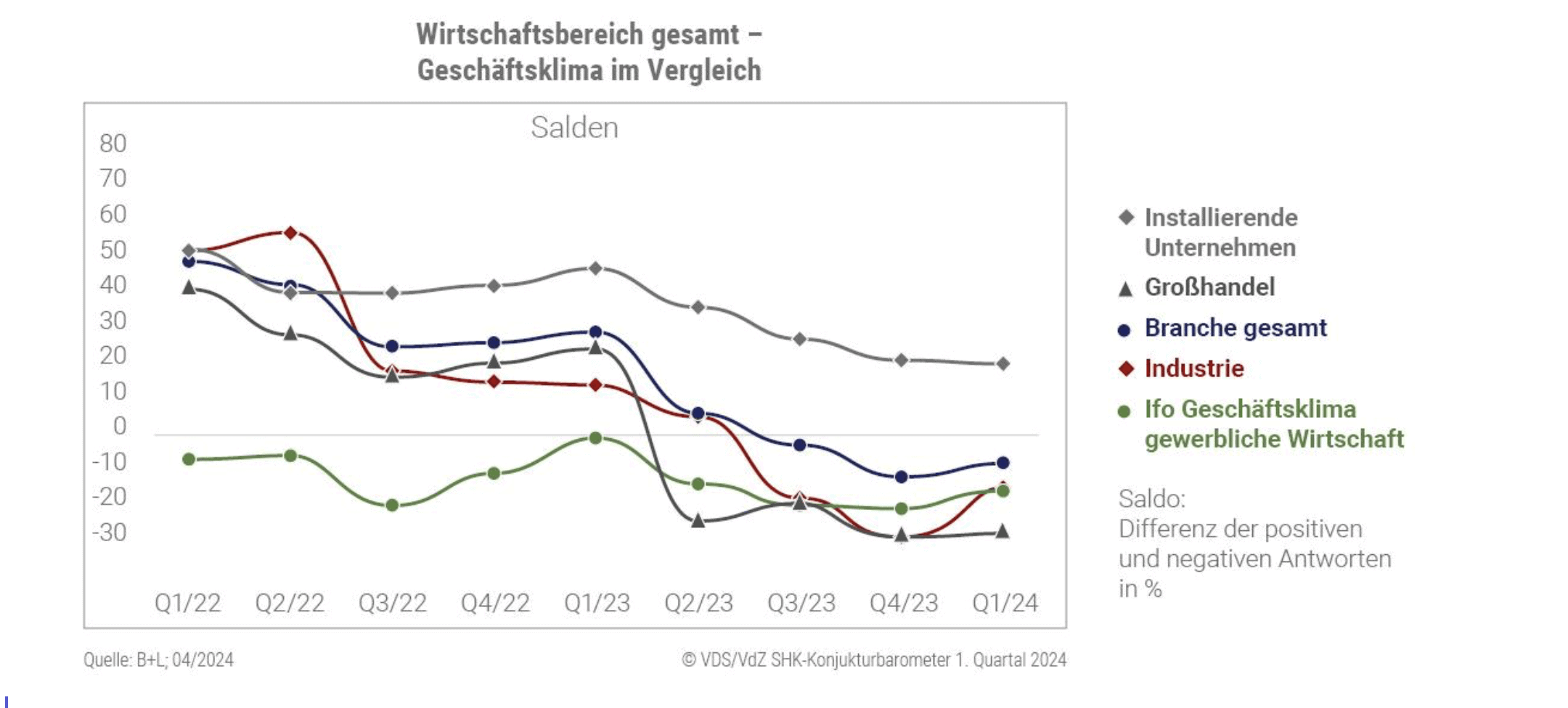 In der Industrie und im Sanitärbereich zeichnet sich eine leichte Entspannung ab.Das Geschäftsklima in der Haus- und Gebäudetechnik liegt im 1. Quartal 2024 mit einem Wert von -acht noch immer im negativen Bereich. Im Vergleich zum Vorquartal ist jedoch eine leichte Verbesserung der konjunkturellen Lage um +vier Punkte zu verzeichnen. Das Geschäftsklima in der SHK-Branche liegt aktuell acht Punkte über dem ifo-Geschäftsklima.