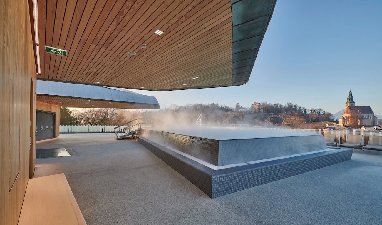Im doppelten Sinn der Höhepunkt eines jeden Saunabesuchs im Paracelsus Bad & Kurhaus ist zweifellos das als Infinity Pool ausgebildete Außenbecken auf der südlichen Dachterrasse. Ein kleiner Teil des Pools dient den Saunagästen als kaltes Tauchbecken, während der Rest als 32° warmes Solebecken ausgeführt ist. Dank des erhöht auf der Dachfläche positionierten Pools mit hochliegendem Wasserspiegel und außen tief angeordneter Überlaufrinne kann der Blick ungehindert über fast ganz Salzburg schweifen. Die sanft gerundeten Poolränder und die anthrazitfarbenen 5 x 5 cm großen Mosaikfliesen der Serie Chroma Plural schaffen eine grazile Kleinteiligkeit, die im als Nacktbadebereich konzipierten Pool für ein geborgenes Wohlgefühl sorgt. Auch wenn sich das Gebäude an vielen Stellen zur Stadt öffnet, ist diese Geborgenheit überall erlebbar. Sie entsteht nicht zuletzt durch das angenehm durchgängige Gestaltungskonzept, das auf natürlichen Farben und Materialien beruht und so eine intuitiv-sinnlich erfahrbare Badewelt bietet – ein wichtiger Aspekt an einem Ort, an dem sich Menschen in verletzlicher Nacktheit begegnen.