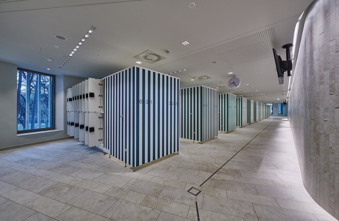 Nach der Zugangskontrolle kommen die Besucher zunächst in den Umkleidebereich, dessen in hellem Grün und Blau gestreifte Umkleidekabinen an luftige Strandkörbe am Meer erinnern. In dieses Bild passen auch die 60 cm langen, abwechselnd in 20 und 30 cm breiten Streifen auf Wänden und Böden verlegten Feinsteinzeugfliesen der Serie Savona von Agrob Buchtal. Ihre lebhaften, bewegten Oberflächen im Farbton Kalk sorgen im Zusammenspiel mit der Unregelmäßigkeit des freien Verbands für eine geborgene, erdig-warme Raumatmosphäre.