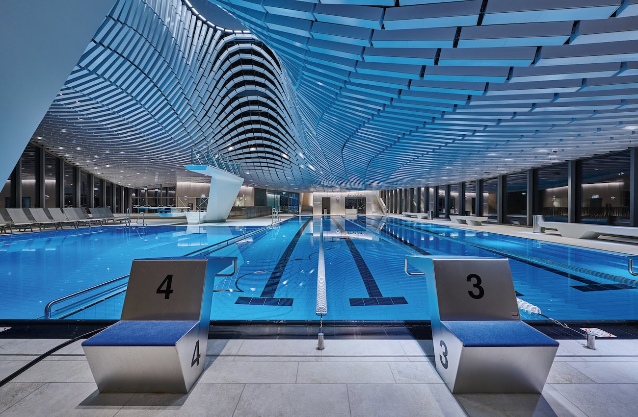 Feinsinnig ausgewogene Farbkomposition in der Schwimmhalle