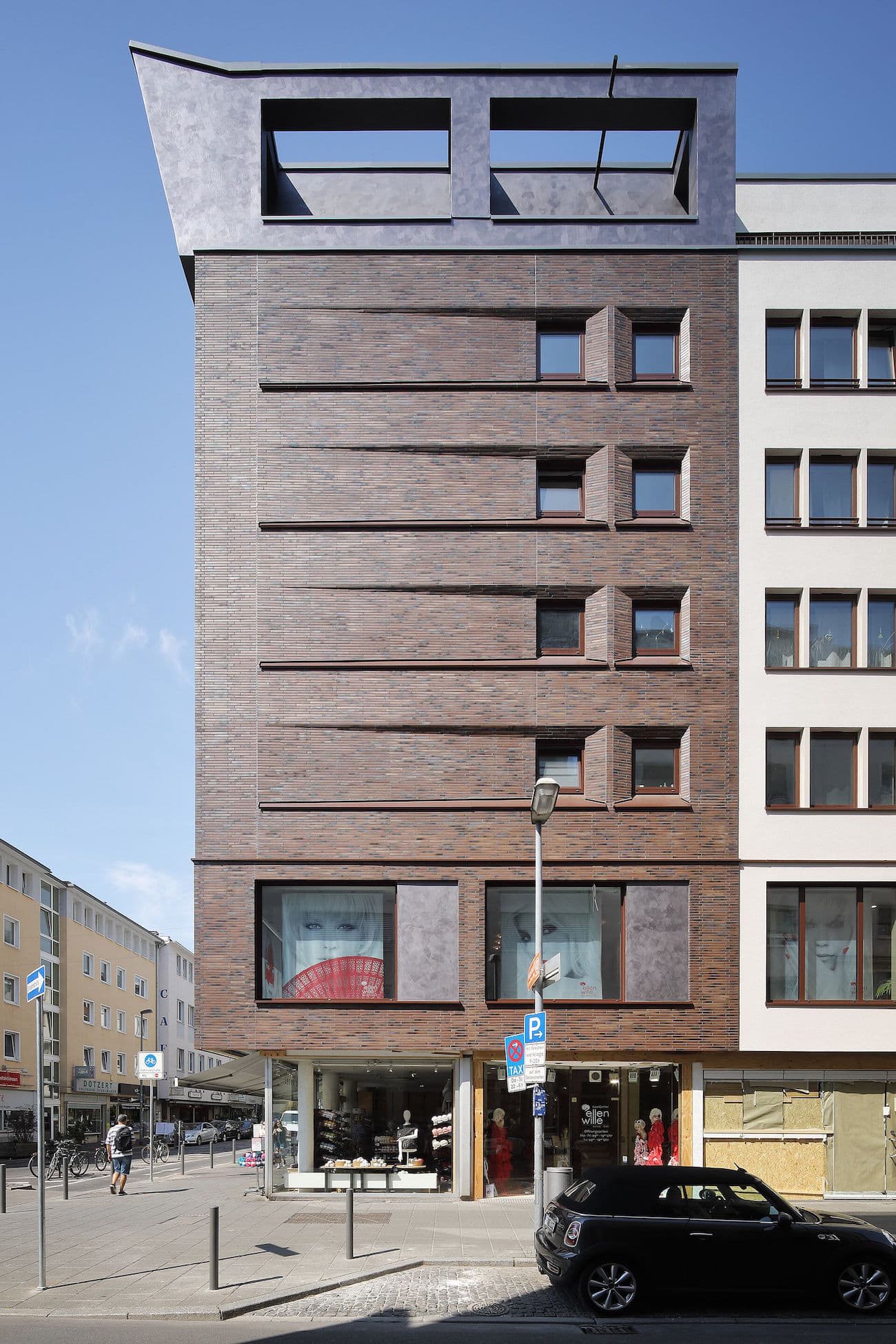 Kraftvoll erstreckt sich der Bau im neuen Gewand: wohl proportioniert, vom durchlaufenden Schaufenstersockel des traditionellen Wollgeschäfts im Erdgeschoss über die weiteren vier Geschosse hinauf bis zum schräg vorspringenden Dachaufsatz. Die verklinkerten Gesimse schmiegen sich wie aus einem Guss an das Gebäude. In Eintracht mit den weit auslaufenden Fensterbänken erzeugen sie eine zusätzliche Tiefe in der in Ströher-Klinkerriemchen gehüllten Fassade.