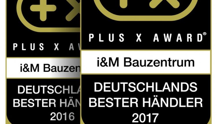 Zum 3. Mal in Folge wird i&M Bauzentrum mit dem Plus X Award ausgezeichnet. Die Fachhändler für Baustoffe, Holz und Fliesen dürfen auch in diesem Jahr wieder den Titel „Deutschlands bester Händler“ für sich in Anspruch nehmen. Gold auf schwarz wird ihnen damit erneut jenes besondere Engagement bescheinigt, für das die bundesweit mehr als 150 Standorte unter dem Markendach i&M Bauzentrum  stehen. Sortimentsgestaltung, Qualität, Infrastruktur, kundenorientierter Service und attraktive Preisgestaltung überzeugten Kunden deutschlandweit, so das Ergebnis der Online-Befragung.