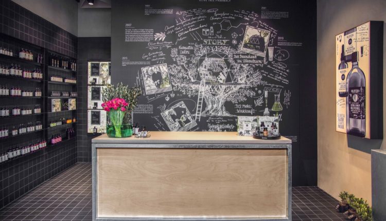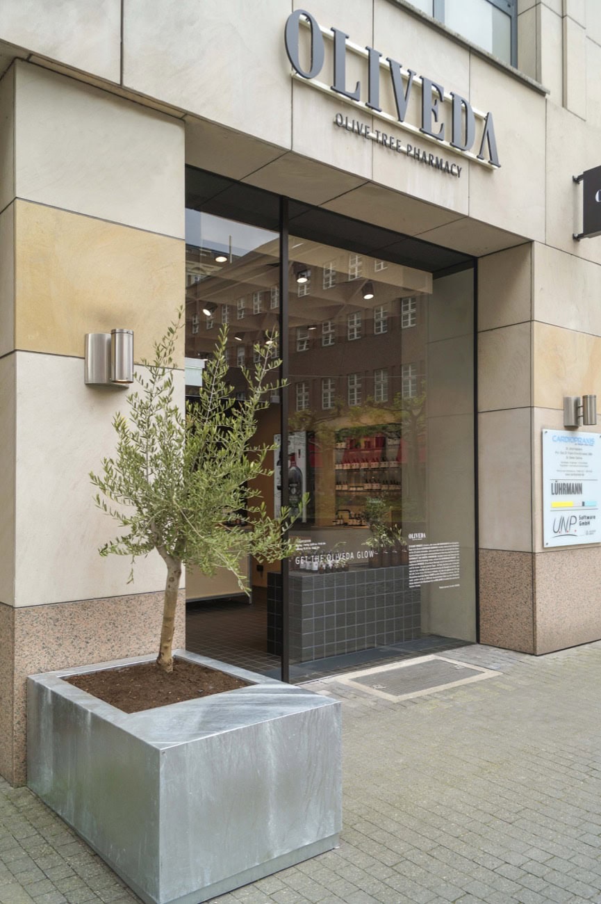 Mit Blick auf den Hauptinhaltsstoff der Produkte prägt der Farbton der schwarzen Olive die Innenarchitektur. Schwarze Wandregale dienen als Plattform zur Präsentation der Produkte und bilden in Kombination mit den schwarzen Wand- und Bodenfliesen einen reizvollen Kontrast zu den Olivenbaumpflanzen im und vor dem Store.