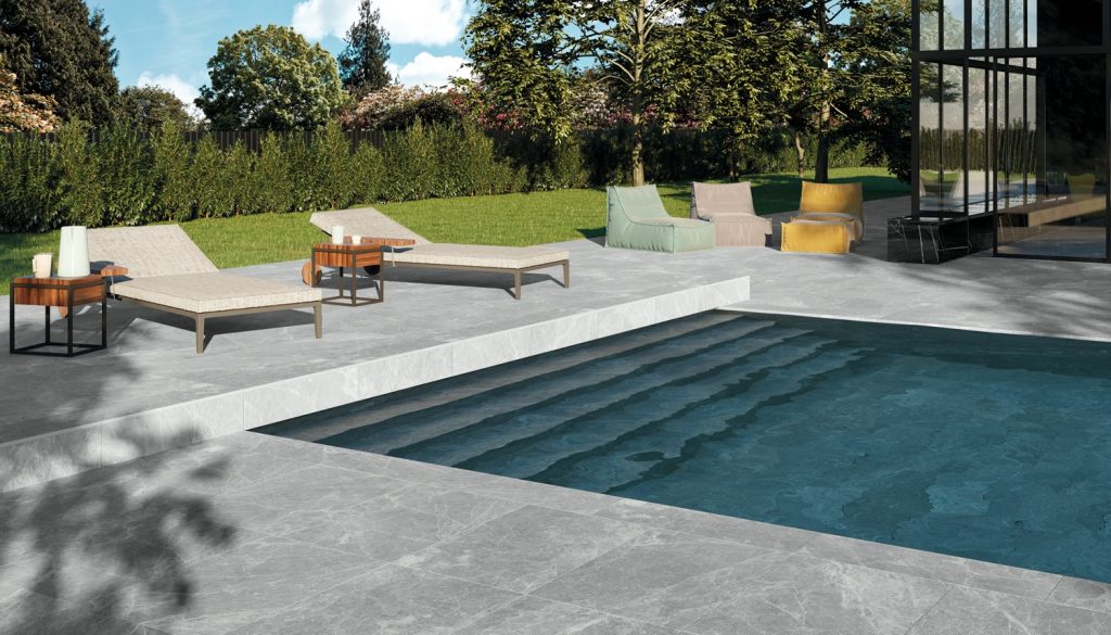 Als drittes Finish punktet „Sabbiata Grip“ mit einem gedämpften Erscheinungsbild und extremer Rutschfestigkeit und eignet sich für Außen- und Wellnessbereiche.