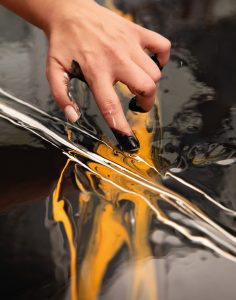 Die Hand des Malers schafft ein großartiges Muster. Farbschichten werden bearbeitet, um ein unverwechselbares Kunstwerk zu schaffen. Es entsteht ein echtes Gemälde als idealer Schmuck für ein elegantes Ambiente.