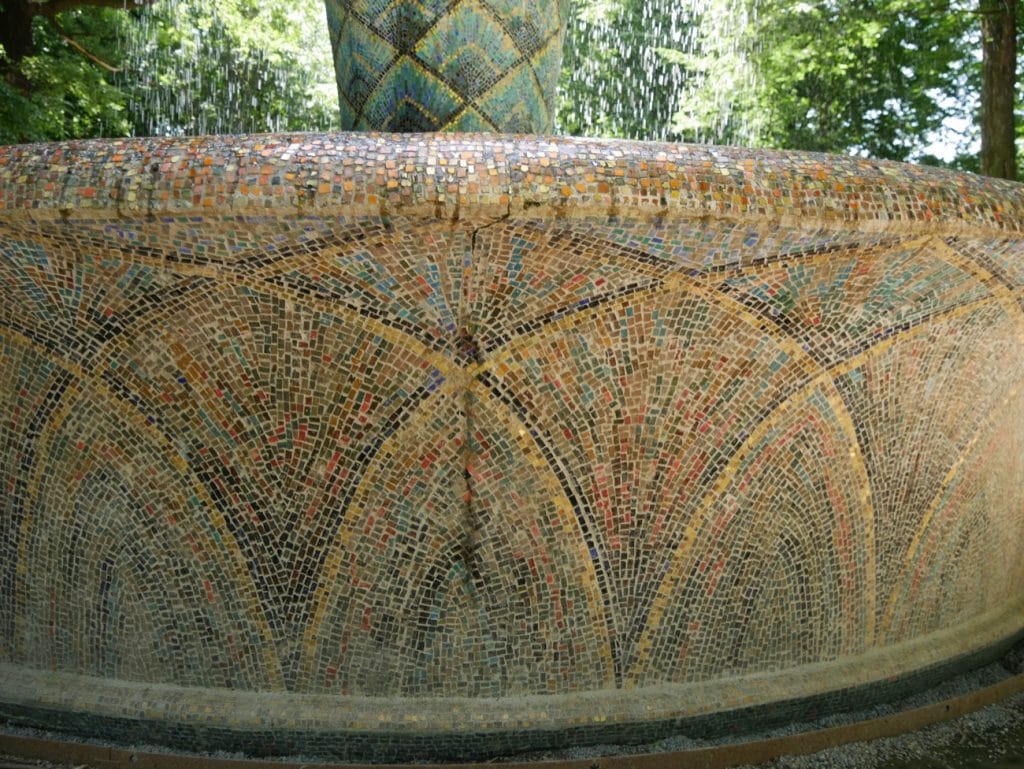 Zunächst erfolgte zur Sicherung und zum Erhalt der Rückbau des historischen Mosaiks auf der wasserführenden Innenseite der unteren Brunnenschale. Diese Mosaikteile wurden in möglichst großen Segmenten vom Untergrund gelöst, abgenommen und anschließend in der Werkstatt der Firma Dyroff von losen, minderfesten Bestandteilen und Mörtelresten befreit und gereinigt. Zur Stabilisierung und zum Ausgleich der unterschiedlichen Segmentdicken wurde auf der Rückseite der Mosaiksegmente mit Elastorapid zunächst Mapenet 150 aufgeklebt und anschließend eine Ausgleichsspachtelung in einer Schichtdicke von bis zu 15 mm aufgebracht. Dabei wurden bereits in der Werkstatt beschädigte Mosaikteilchen originalgetreu ersetzt.