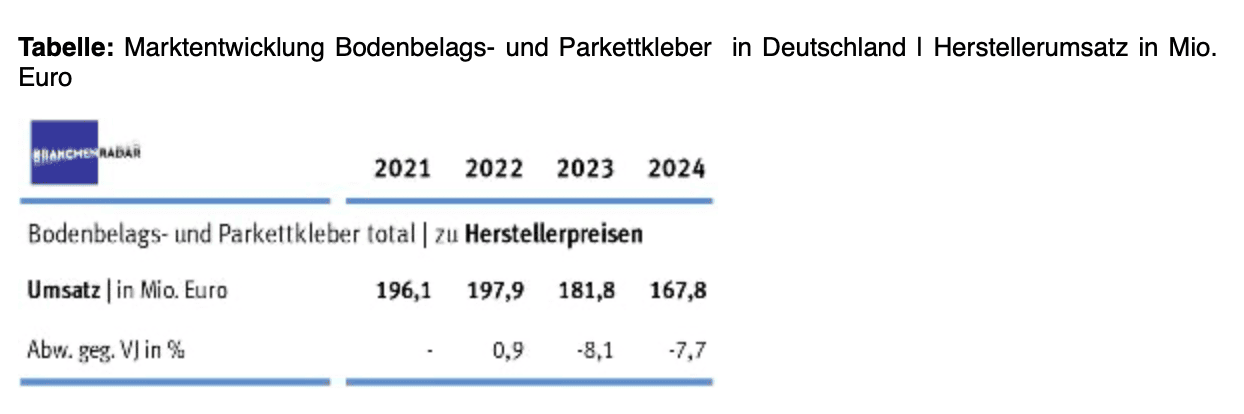Der deutsche Markt für Bodenbelags- und Parkettkleber schrumpfte im Jahr 2024 nahezu ungebremst. Insbesondere Kleber für Parkett und Holzböden standen unter Druck, zeigen aktuelle Daten einer Marktstudie des Marktforschungsinstituts Branchenradar Marktanalyse.