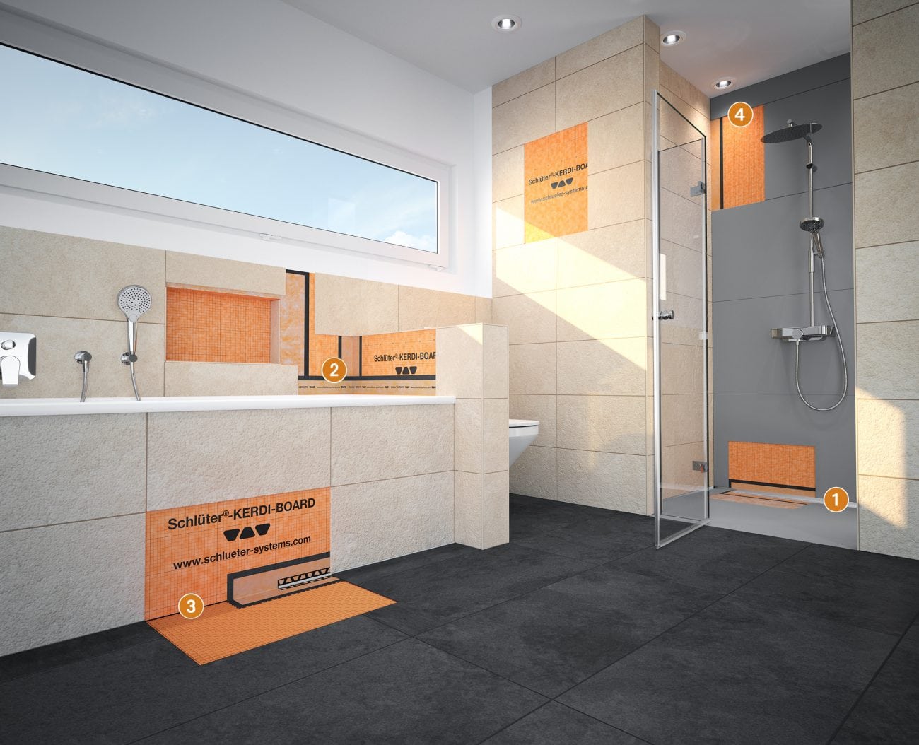* Bereiche unter bzw. hinter Dusch- und Badewannen müssen vor Wassereinwirkung geschützt werden – entweder durch den Anschluss des Rands an die Abdichtungsschicht oder durch das Fortführen der Abdichtungsschicht unter und hinter der Wanne (Bild Badabdichtung, Punkt 2);