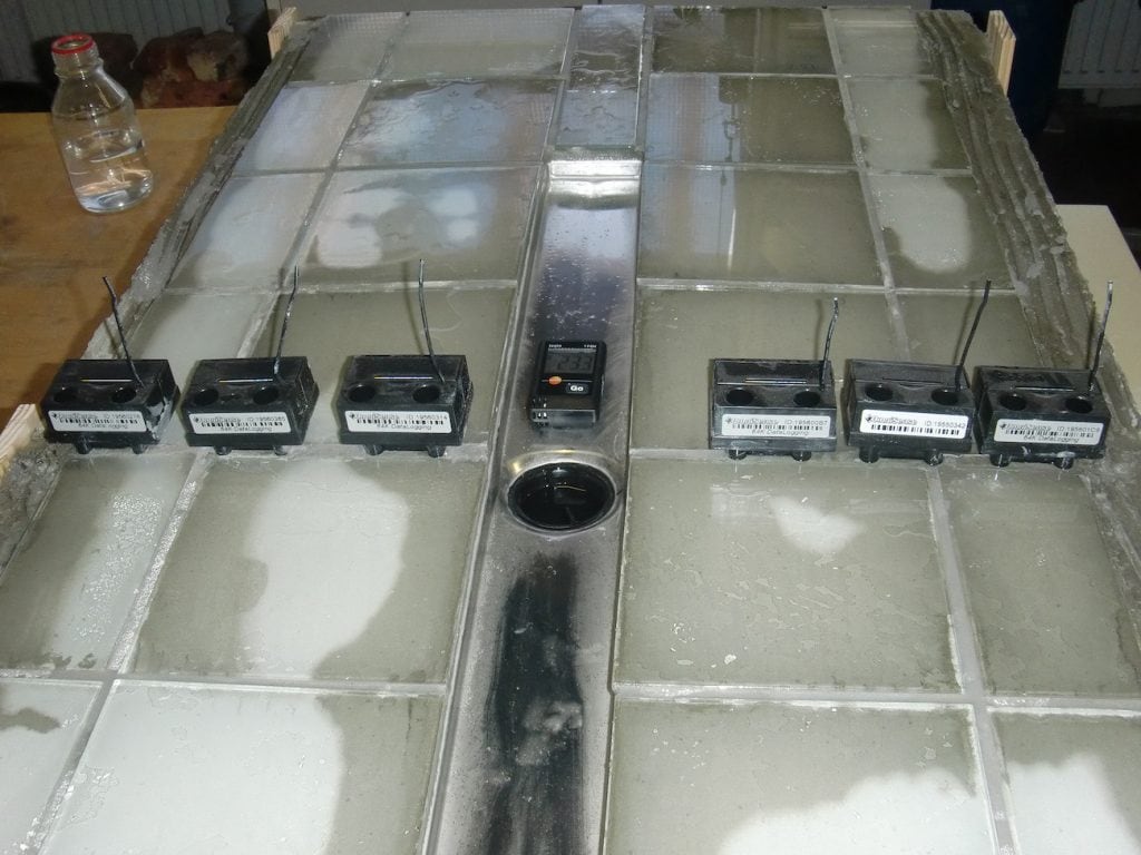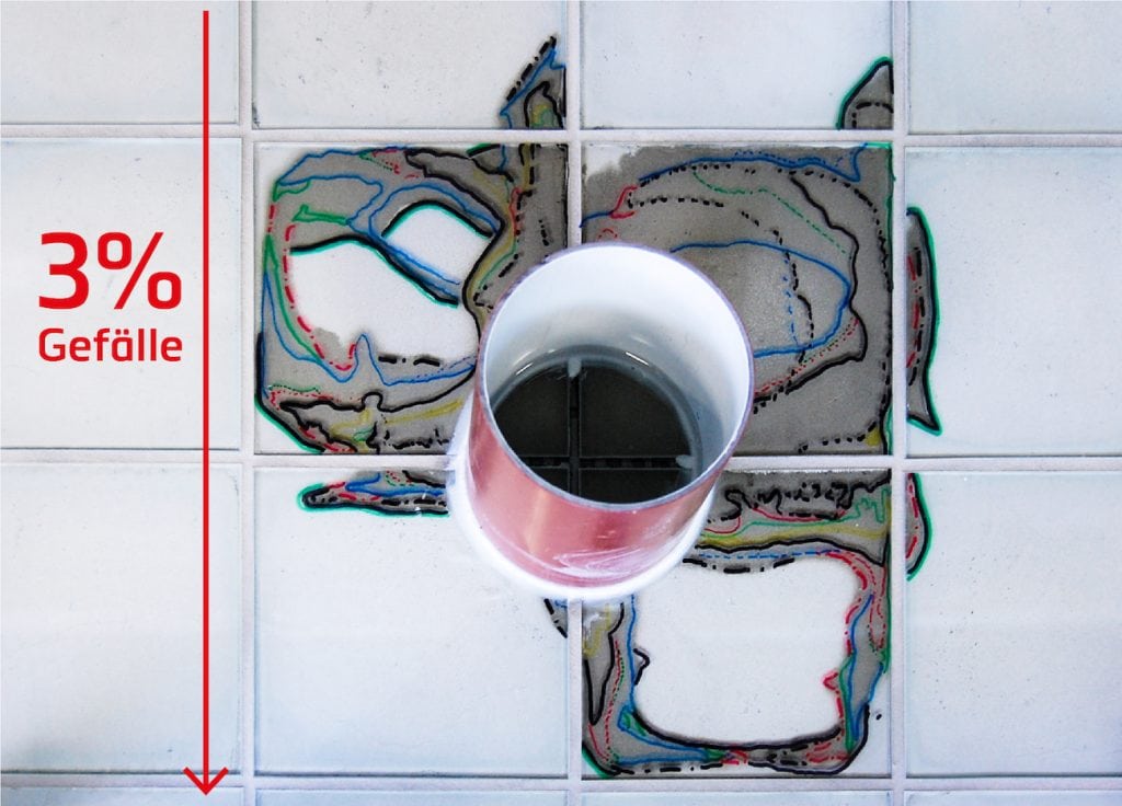 Aktuelle Forschungsergebnisse wie die des österreichischen Forschungsinstituts OFI (www.ofi.at) zeigen aber, dass das so nicht funktioniert: In den Kleberschichten zwischen der Verbundabdichtung und den Fliesen fließt eingedrungenes Wasser mitnichten über ein Gefälle ab. Vielmehr verteilt es sich unter den Fliesen ausschließlich durch Kapillarkräfte und zwar in alle Richtungen weitgehend gleichmäßig, also entlang des Gefälles bergauf und bergab sowie auch seitwärts. Dies zeigt das Bild des Prüfkörpers mit Glasfliesen aus dem Labor des Instituts. Das Ergebnis ist auch nicht verwunderlich, da in Duschen keine Drainageebene aufgebracht wird, sondern der Fliesenbelag im Dünnbettverfahren verlegt wird, wie die DIN 18534 es ebenfalls fordert. Eventuell eingedrungenes Wasser verschwindet ausschließlich über Verdunstungs- und Diffusionsvorgänge über die Fliesenfugen. Das hier zitierte Forschungsprojekt wurde vom Hersteller TECE beauftragt.