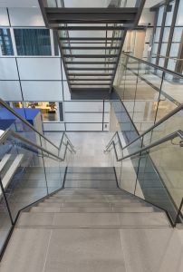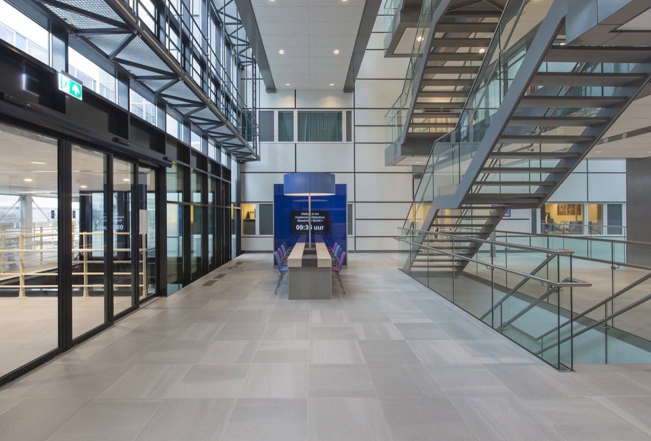 „Der Fußboden ist die Visitenkarte einer Eingangshalle. Er bestimmt die Atmosphäre und trägt dazu bei, dass die Besucher sich in einem großen Gebäude zurechtfinden, sich gut orientieren können und sich somit auch wohlfühlen. Und das ist beim neuen Anbau des Universitätsklinikums Maastricht (MUMC+) bestens gelungen“, erklärt Architekt Luc Nooijen vom Maastrichter Architekturbüro Architecten aan de Maas. „Wenn ich mir jetzt – ein halbes Jahr nach der Einweihung – das Gebäude so anschaue, sehe ich, wie gut es mit seinem modernen und robusten Erscheinungsbild zum hellen, klinisch wirkenden Altbau passt. Trotz eines umfangreichen Anforderungskatalogs haben wir es geschafft, ein Gebäude zu realisieren, das eine angenehme Leichtigkeit und zugleich die Wärme und Entspannung ausstrahlt, die man von einem zeitgemäßen Bau erwarten darf.“