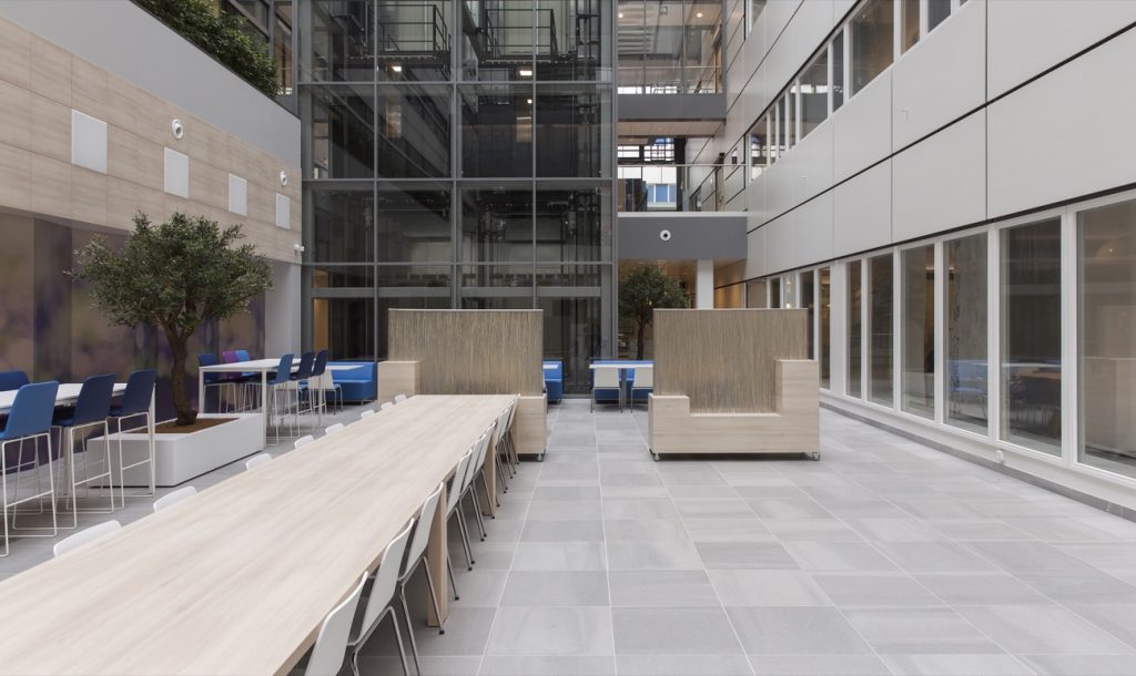 Obwohl wir mit der Farbstruktur der 60 x 60 Zentimeter großen Solids-Fliesen dem Fußboden ganz leicht eine Laufrichtung hätten geben können, haben wir uns bewusst dagegen entschieden und die Fliesen rechtwinklig verlegt. Der Boden bekam so auf natürliche Art einen edlen, zeitlosen Charakter und der Raum wurde optisch subtil vergrößert.“ Maase: „Die technischen Eigenschaften von Solids sind ähnlich wie die unserer anderen Fliesenserien. Solids ist sehr trittfest, hat eine ebene, maßhaltige Oberfläche und ist leicht zu reinigen. Letzteres gilt auch für die Fugen, die sehr schmal sind und bündig zur Fliesenoberfläche abschließen. Wir sind von der Zufallsverteilung der Schattierungsrichtung besonders begeistert. Der Raum wirkt dadurch neutraler, da sich der Fußboden mit dieser Verlegeweise trotz seiner monumentalen Erscheinung den Funktionen des Gebäudes unterordnet. Dieses Projekt macht einmal mehr deutlich, wie wertvoll der Austausch und die Zusammenarbeit zwischen Mosa und den Architekten ist.“