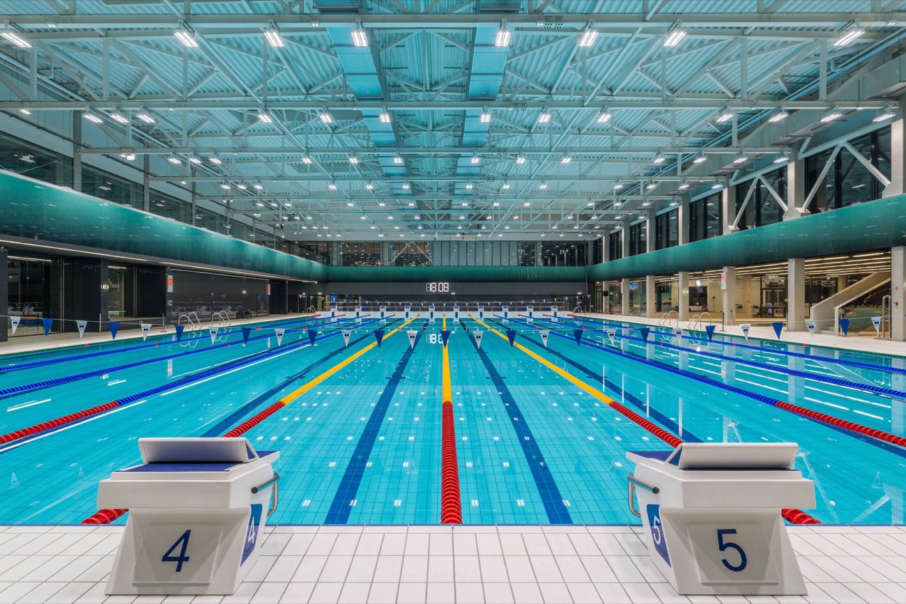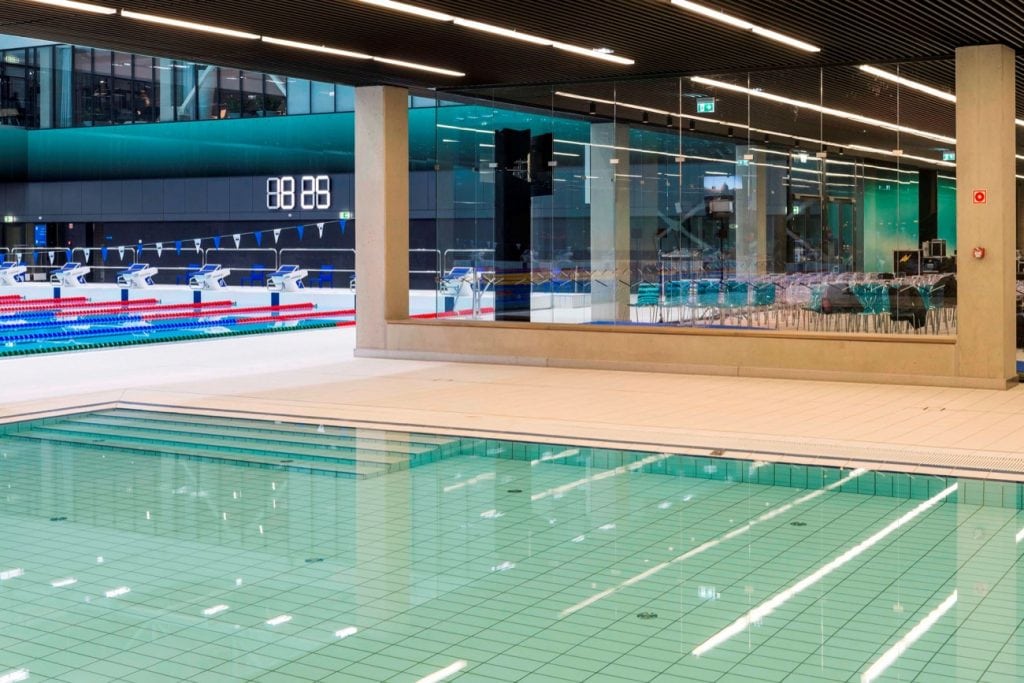 Bereits von außen vermittelt das Bauwerk seine Funktion selbstbewusst und zugleich filigran durch die elegante, wellenförmige Formensprache der Längsseiten. Für die Beckenränder der Pools wählte man jeweils das zeitgemäße System Finnland von Agrob Buchtal: Der schräge, strandähnlichen Auslauf unterbindet Wasserrückschlag und beugt so einer Benachteiligung der Schwimmer auf den Außenbahnen vor. In Verbindung mit der durchgängigen Wassertiefe des Wettkampfbeckens von 3 m statt der üblichen 2,20 m werden so ideale Wettkampfbedingungen geschaffen. Auch die anderen Aspekte der Keramikbecken erfüllen die Vorgaben der FINA, deren Einhaltung Voraussetzung für die Anerkennung offizieller Rekorde ist. Die Fliesen der Serie ChromaPlural in den Pools sind bewusst unprätentiös in klassischem weiß-blau gehalten, um die Akteure nicht unnötig abzulenken, sondern eine professionelle Bühne für Spitzensport zu bieten. Gleiches gilt für die Beckenumgänge: Der Farbton „Alabasterweiß“ der Serie Quantum ist frisch und neutral, vermittelt aber dennoch optische Wärme und vermeidet störende Reflexe dank samtartiger Oberfläche. Zudem betonen die Betreiber, dass das Rasterprofil nicht nur trittsicher, sondern auch ausgesprochen reinigungsfreundlich ist.