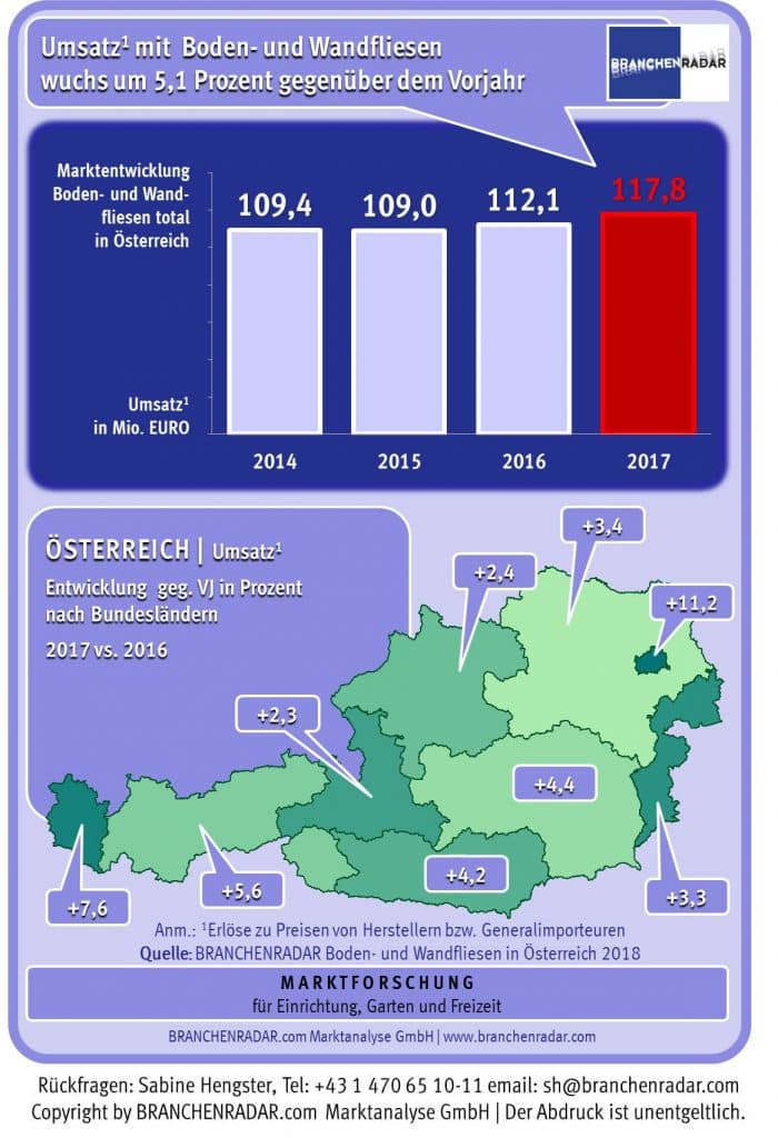 Der Umsatz mit Bodenfliesen und Wandfliesen in Österreich erhöhte sich zu Preisen von Herstellern bzw. Generalimporteuren im Jahr 2017 um 5,1 Prozent geg. VJ auf 117,8 Millionen Euro, berichtet der Informationsdienst Branchenradar in seiner jüngsten Presseinformation. Für den stark aufwärtsgerichteten Trend war nicht zuletzt eine weiterhin rasch wachsende Nachfrage nach höherwertigen Produkten verantwortlich, allen voran nach Feinsteinzeug. Dadurch stieg der Durchschnittspreis auf Ebene der Warengruppe im vergangenen Jahr robust um drei Prozent geg. VJ. Die steigende Nachfrage um zwei Prozent geg. VJ lieferte den Rest.