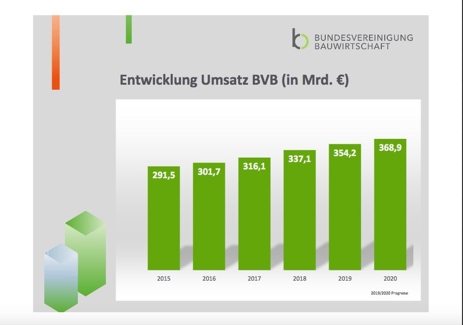 6. Dezember 2019„Wir blicken auf ein gutes Baujahr 2019 und erwarten ein Umsatzwachstum von 5 %; das entspricht einem Umsatz von 354 Mrd. Euro, den unsere 370.000 Mitgliedsbetriebe erwirtschaftet haben. In 2020 wird der Branchenumsatz auf fast 370 Mrd. Euro steigen, was einem Plus von 4,2 % entspricht.“ Dieses erklärte der Vorsitzende der Bundesvereinigung Bauwirtschaft, Marcus Nachbauer, […]weitere Beiträge über Schlüter