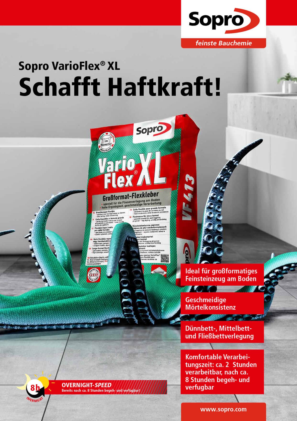 - Sopro Fliesenkleber-Neuheiten 201924. Juni 2019- Der Trend zu immer größeren keramischen Fliesen und Platten ist unübersehbar. Megaformate mit Plattengrößen bis 3,20 x 1,60 m sind heute keine Seltenheit mehr. Das A und O für die sichere Verlegung solcher Formate ist ein fundiertes Know-how bezüglich der Wahl der richtigen Verlegeprodukte und -verfahren. Nur so lassen sich schon von vornherein Risiken mindern […]weitere Beiträge über Schlüter