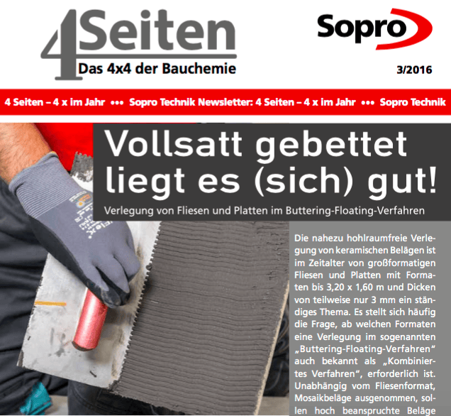 9. September 2016Im Zeitalter von großformatigen Fliesen und Platten mit Formaten bis 3,20 x 1,60 m und Dicken von teilweise nur 3 mm ist sie ein ständiges Thema: Die nahezu hohlraumfreie Verlegung im sogenannten „Buttering-Floating-Verfahren“. Was bei Verlegarbeiten im „Kombinierten Verfahren“ zu beachten ist – dies zeigt der neueste Sopro Technik Newsletters „4×4 der Bauchemie“ mit dem […]weitere Beiträge über Schlüter