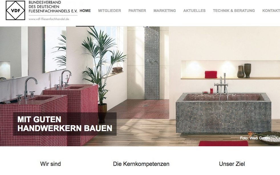 2. August 2018Der Bundesverband des Deutschen Fliesenfachhandels (VDF) geht mit neuer Webseite online. Der neue VDF-Webauftritt unter www.vdf-fliesenfachhandel.de zeichnet sich durch eine kompaktere und logisch aufgebaute Menüstruktur aus. Das Logo ist präsenter und fügt sich mit dem ergänzten Claim optimal in die Menüleiste ein. Es wurden kontrastreiche Farben gewählt und mit weißen Flächen gearbeitet, wodurch die gesamte Webseite […]weitere Beiträge über Schlüter