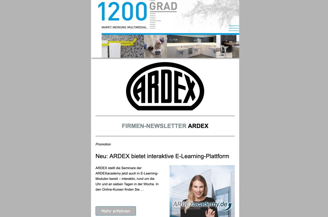 22. September 2020Der Bauchemiehersteller ARDEX aus Witten lieferte diese Woche unseren Firmen-Newsletter. Mit vielen spannenden Themen rund um die Themen Produkte, Objekte, Fortbildungen. Dabei geht es u.a. um eine neue, interaktive E-Learning-Plattform, die Schulungen in der ARDEXacademy, das Objekt Hotel Das James in Flensburg und die Social Media Kanäle des Unternehmens. Schau Sie doch mal rein! Hier […]weitere Beiträge über Schlüter