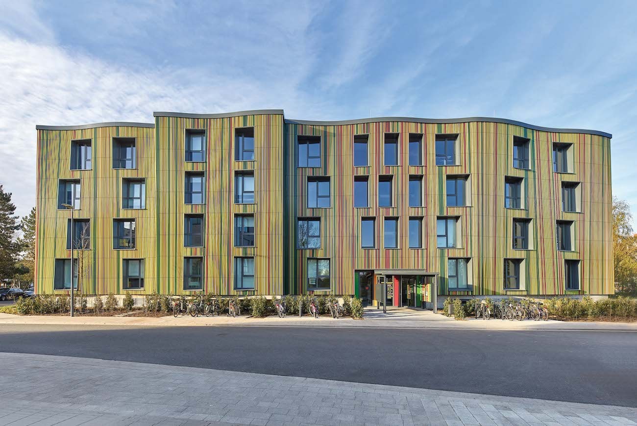 10. September 2020Am Rand einer Grünfläche unweit der Universität liegt dieses neue Studentenwohnheim des Studentenwerks Osnabrück. Das Haus fällt sofort ins Auge, allein weil es anders als die meisten Campusgebäude nicht grau ist. Stattdessen erscheint es angenehm farbenfroh – dank der mit Keramik-Formteilen der Serie „KeraShape“ von Agrob Buchtal bekleideten Fassade. Faszinierend ist aber nicht allein die Farbe, sondern auch das in jeder Hinsicht schlüssige Architekturkonzept.weitere Beiträge über Schlüter